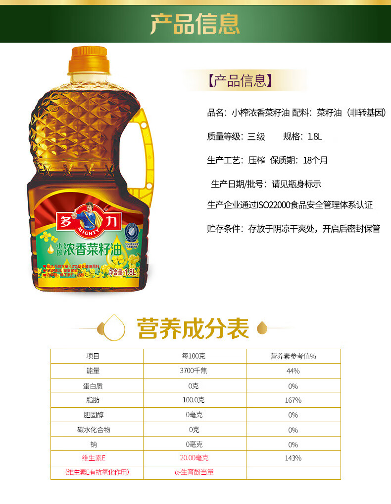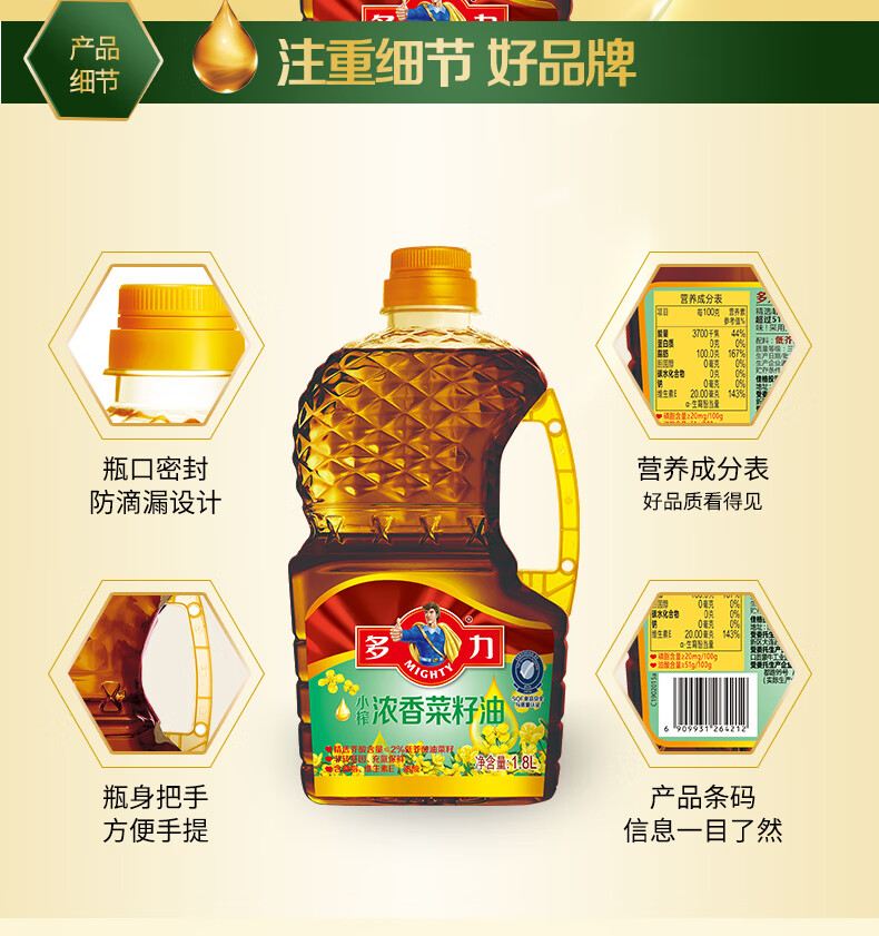 多力小榨浓香菜籽油1.8L