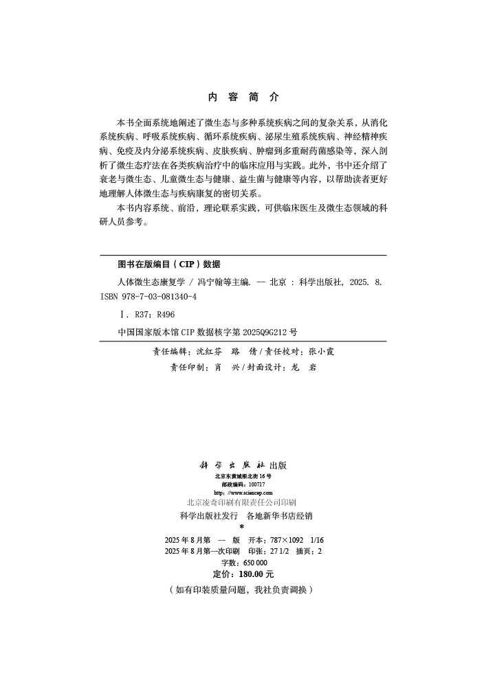 人体微生态康复学 冯宁翰 翟齐啸 徐华 赵善超 本书全面系统地阐述了微生态与多种系统疾病之间的复杂关系9787030813404科学出版社