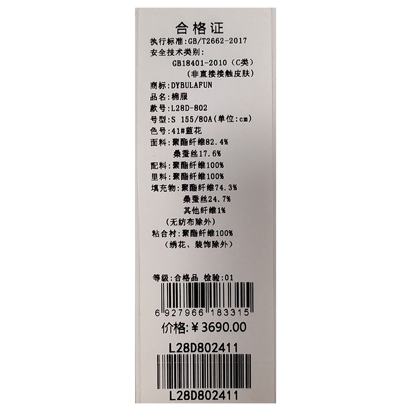 戴布拉芬棉服L28D802