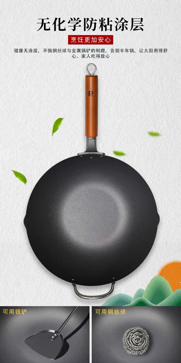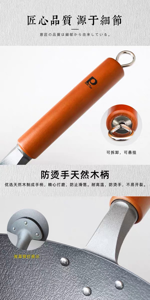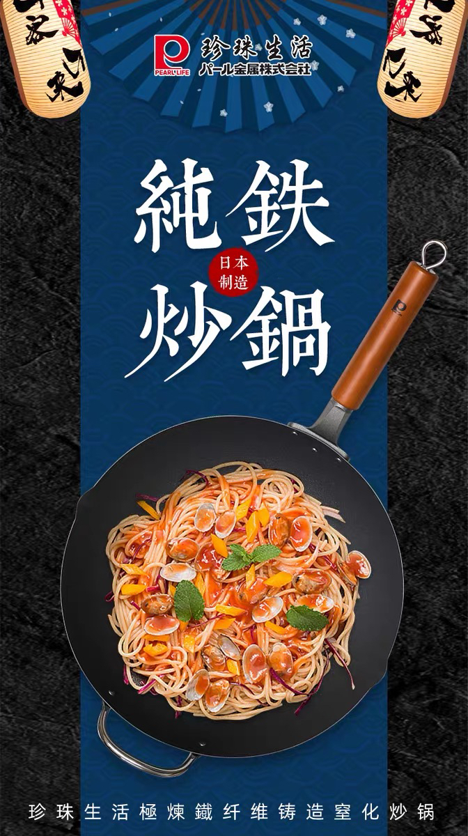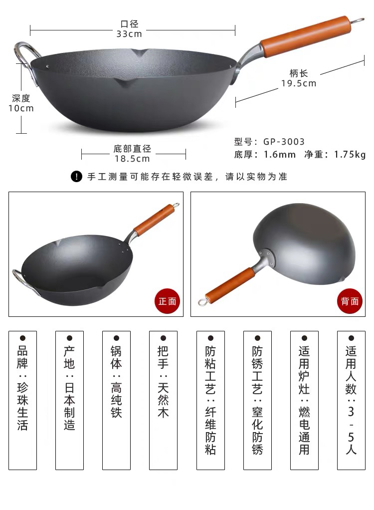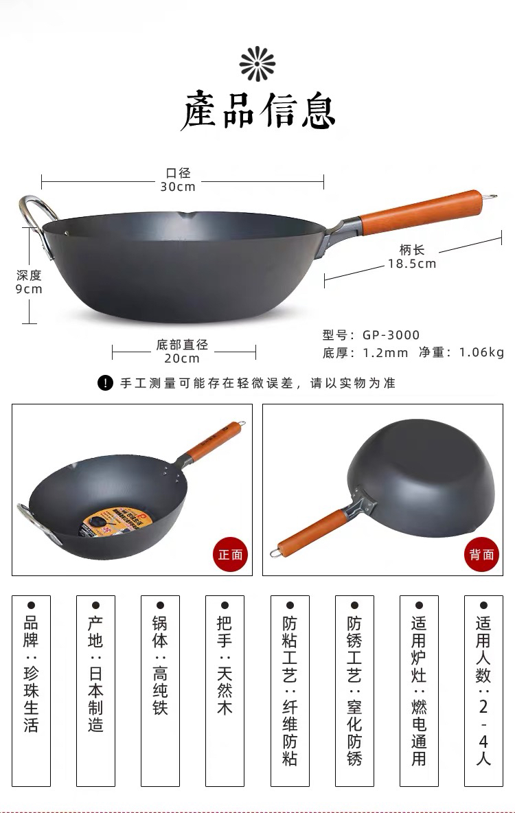 珍珠生活日本进口无涂层不易粘炒锅铁锅家用平底炒锅GP-3003