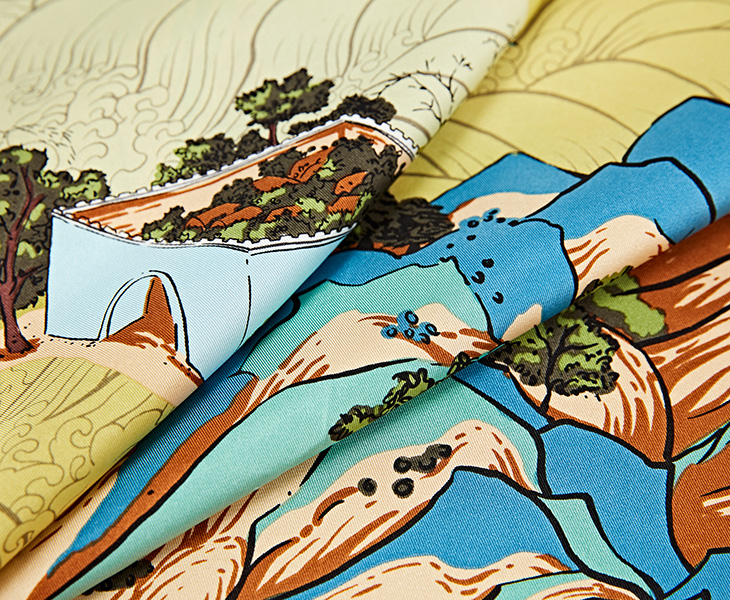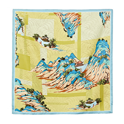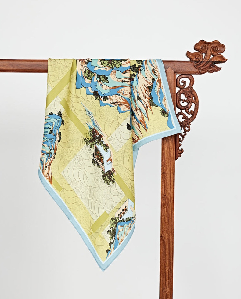 采用柔滑轻盈的桑蚕丝面料,搭配丝路山水卷轴的图案,致敬丝绸之路,整体布局均衡大气。