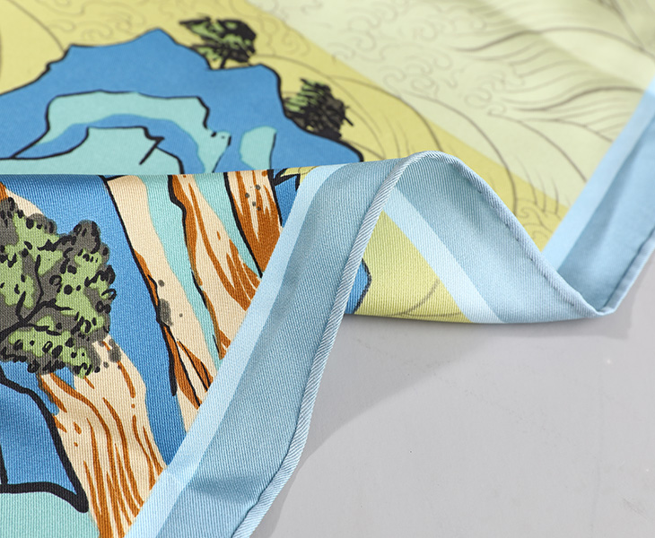 这幅地图的出现以实物证明了在西方地图传入中国之前中国对世界地理,特别是对于丝绸之路沿线已经有清晰的认识。蜿蜒两万公里的丝绸之路,是古人经济文化交流的重要纽带,延绵数千年的丝路历史,是世界文明的辉煌诗篇。此款丝巾选取了丝绸之路以嘉峪关为重点的几个重要的关口进行重新整合描绘;不同色度的几何方块与此图独具特色的海水纹结合,继承传统纹样的同时,不失现代主义风格;颜色撞色明亮、清新淡雅;是提亮整体造型的必备单品。
