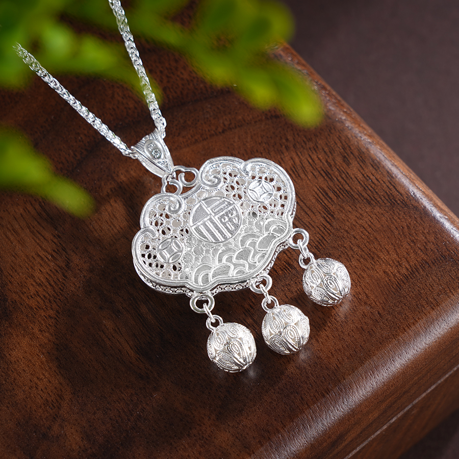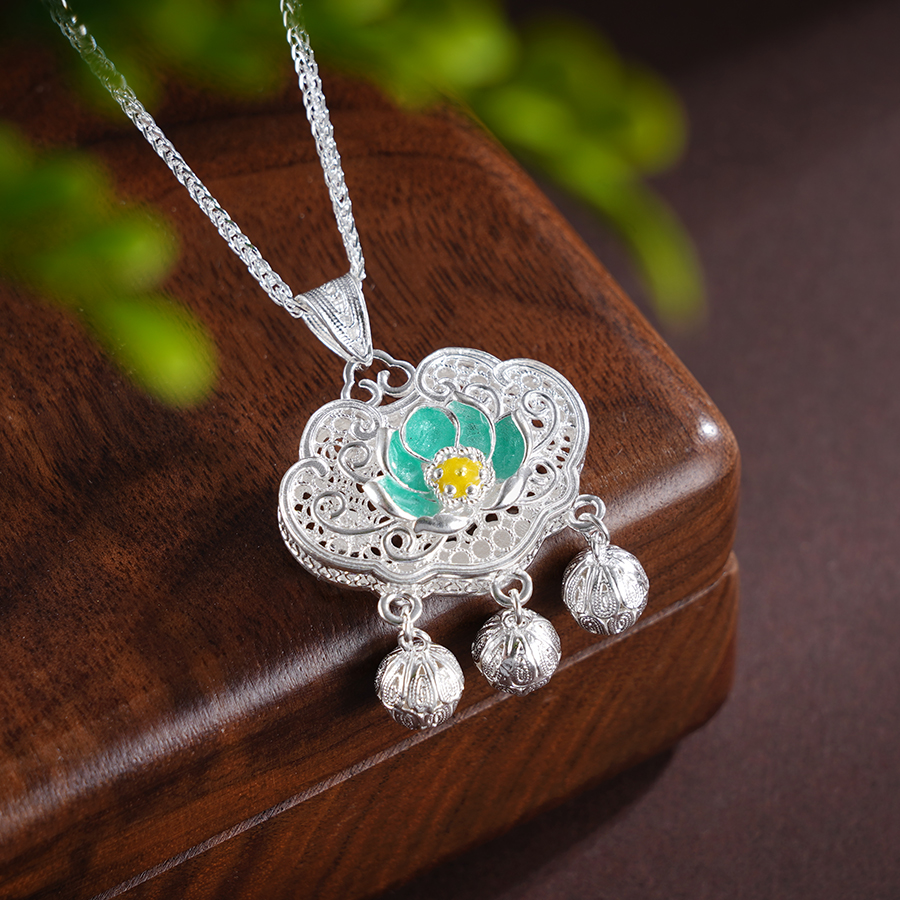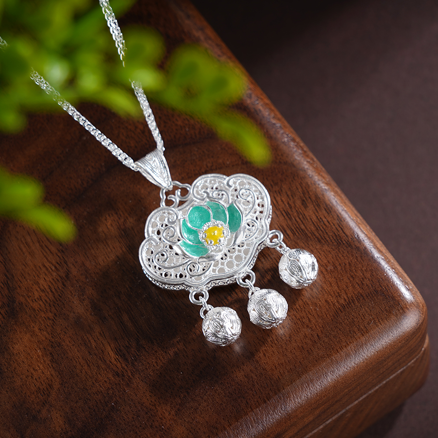 【寓意】:采用银花丝工艺编织如意锁,其上施以珐琅工艺塑造清雅莲花。整体设计典雅优美,色彩明艳动人。寓意连连好运连绵、平安吉祥。