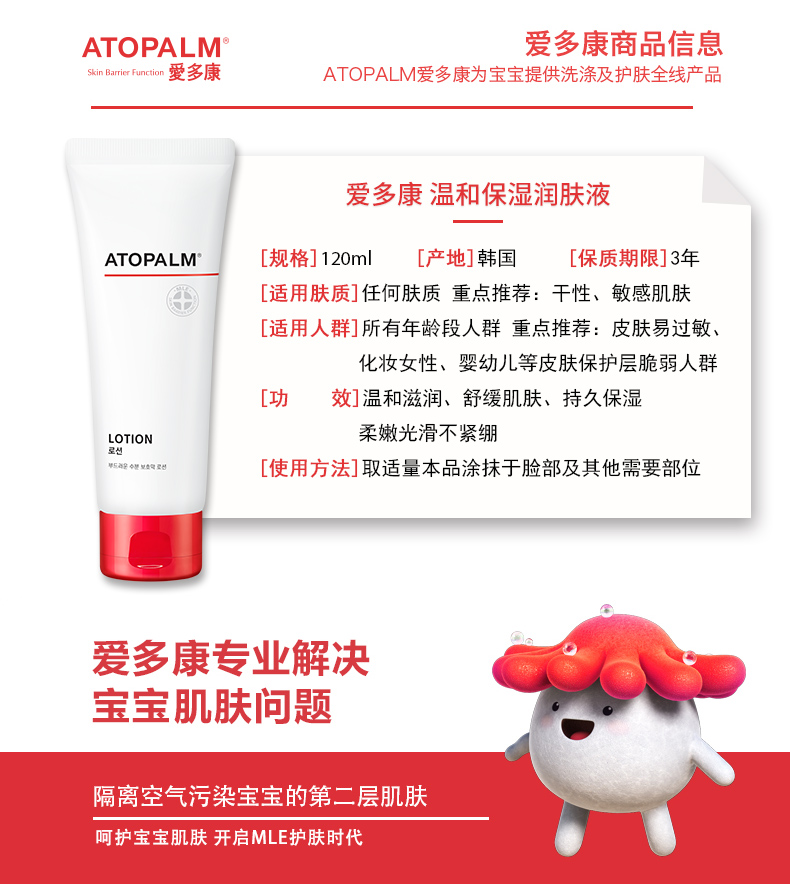 韩国ATOPALM爱多康温和保湿润肤乳婴幼儿童乳霜身体乳晒后修复120ml