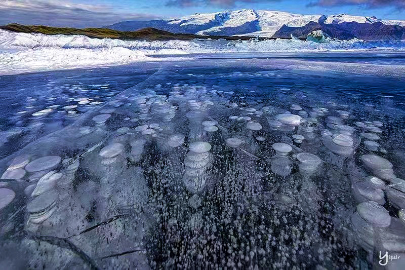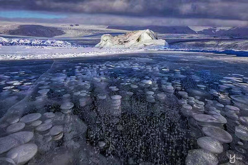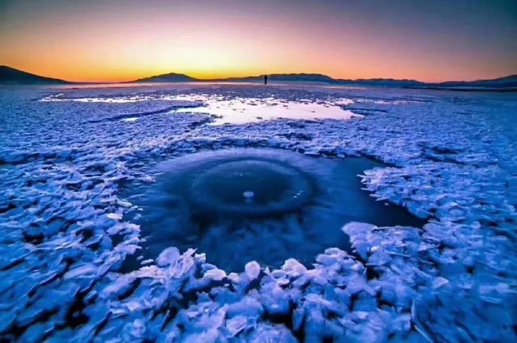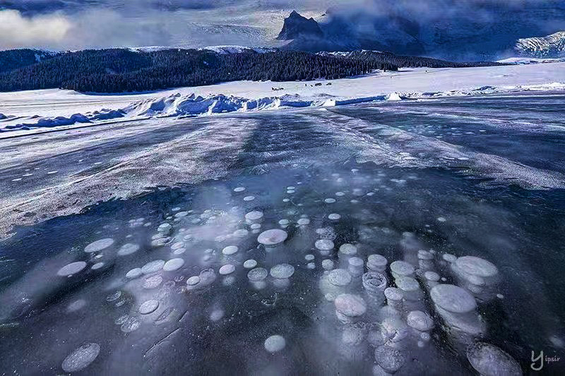 清晨前往赛里木湖拍摄日出,环湖边继续拍摄冰气泡、蓝冰等,之后前往天鹅泉入住当地民宿。