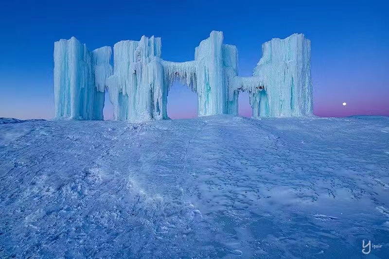 早上继续拍摄天鹅泉日出晨景,之后乘车赴昭苏,抵达蓝冰玉湖拍摄,途观冰雪伊犁美景。