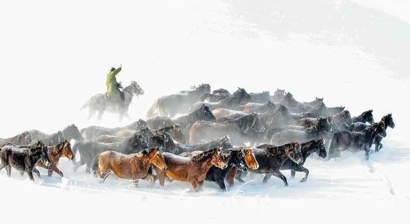 全天拍摄天马文化节活动场景,牧民甩起马鞭,200余匹骏马由远及近,从远处模糊的一群小点,到卷起雪雾奔腾而来,场面壮观恢弘。在天马文化园、昭苏湿地公园,可以拍摄到天马踏雪、雪地赛马、雪中刁羊等场景(节目内容仅供参考,请以景区安排为准)。