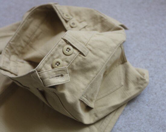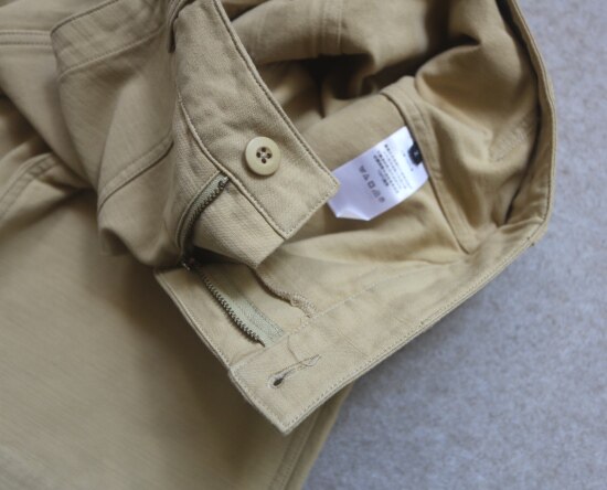 前襟 纽扣+拉链 两侧斜插式口袋 上下口袋边有加固缝线 翻盖纽扣式的屁兜