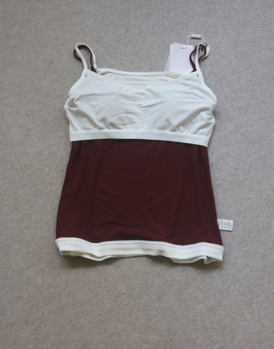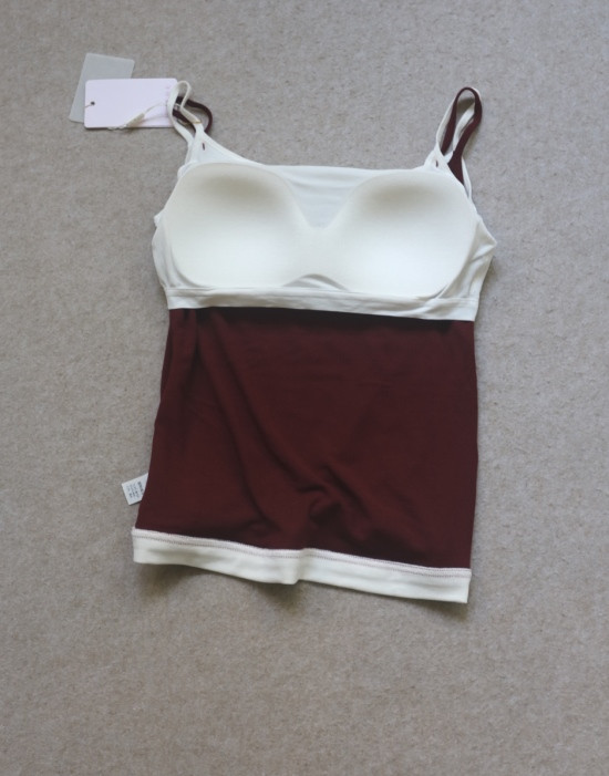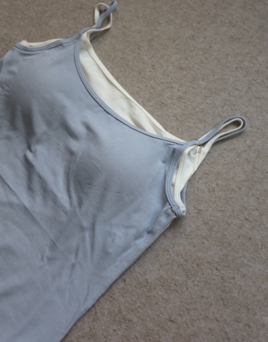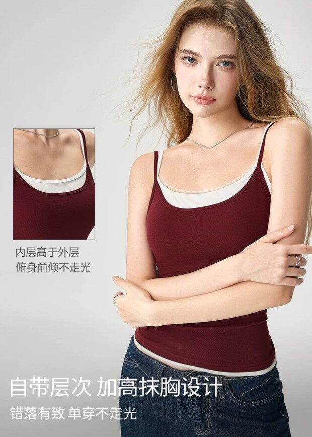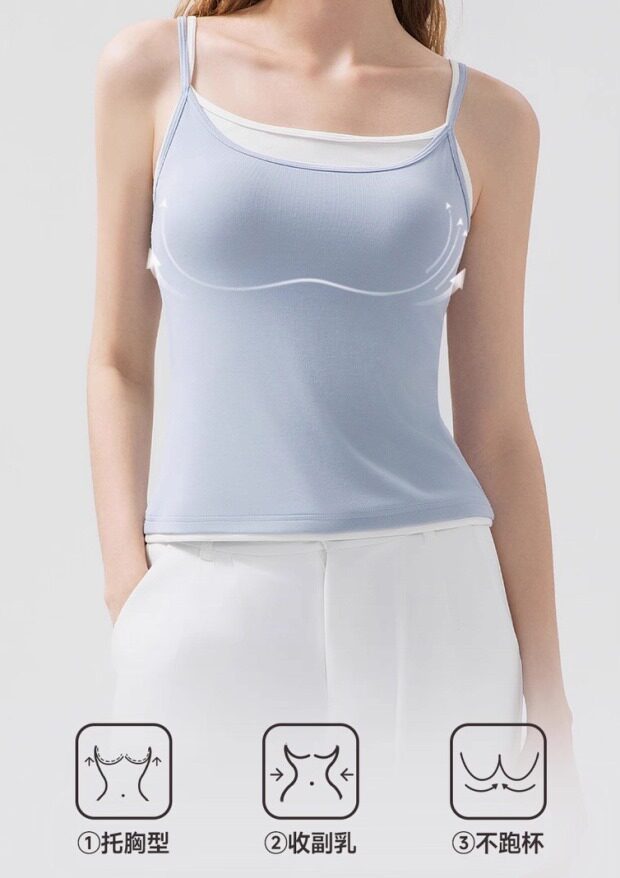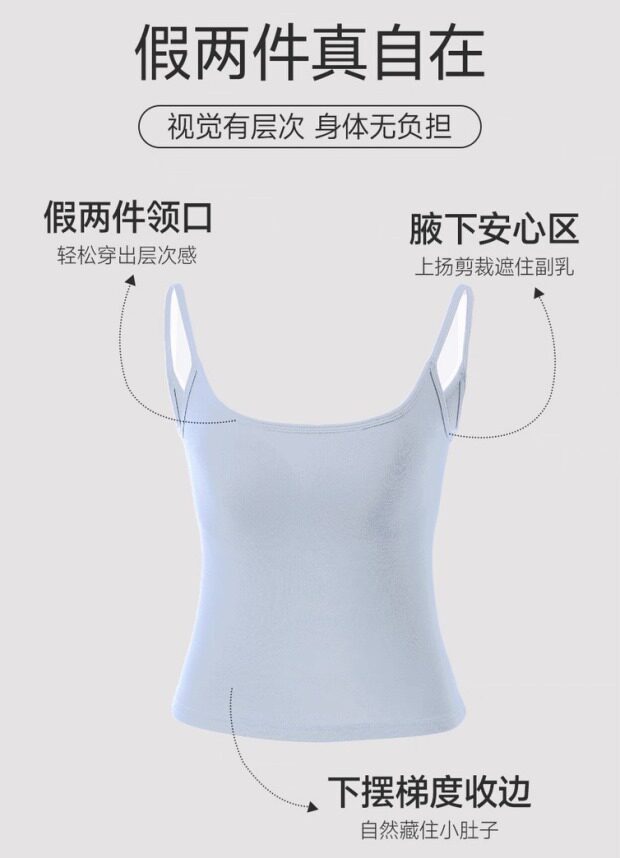 假两件的小吊带 内嵌式胸垫 露锁骨 环腋也不是很低 微包身的 不易走光