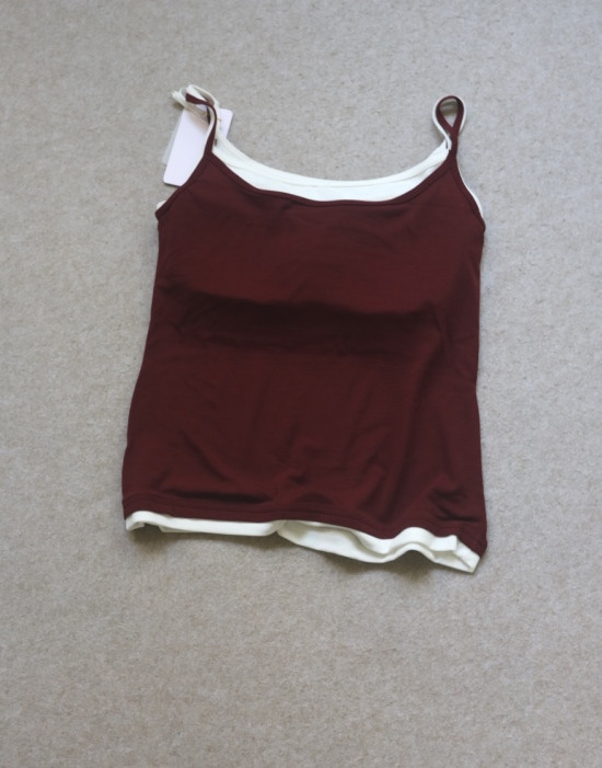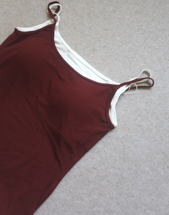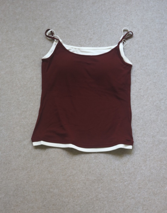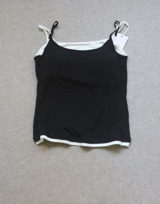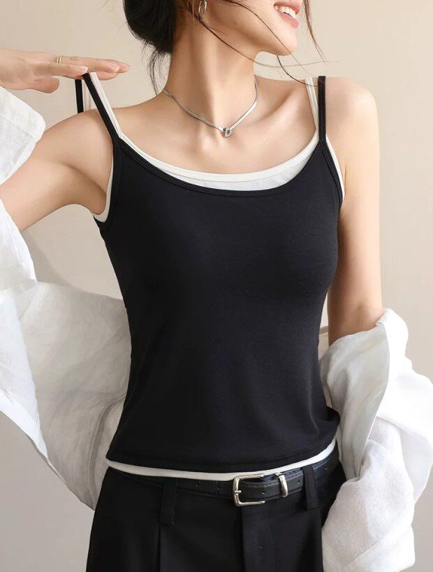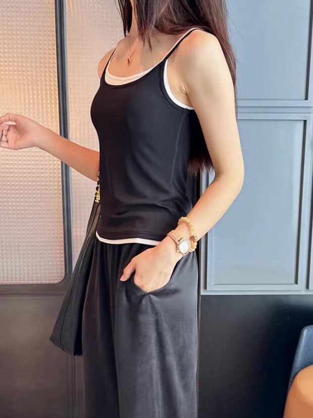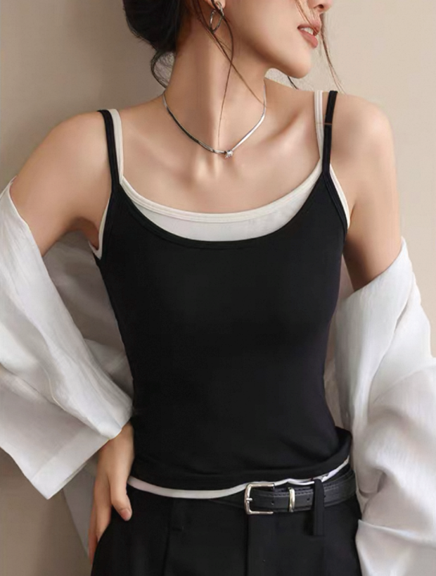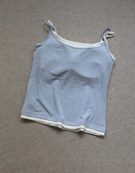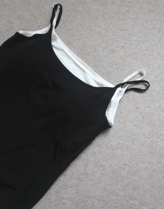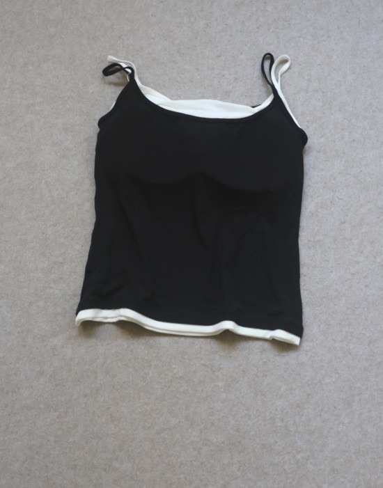 版型方面 假两件的样式 两根细肩带 里衬都是白色 底边 是拼接上的小白边