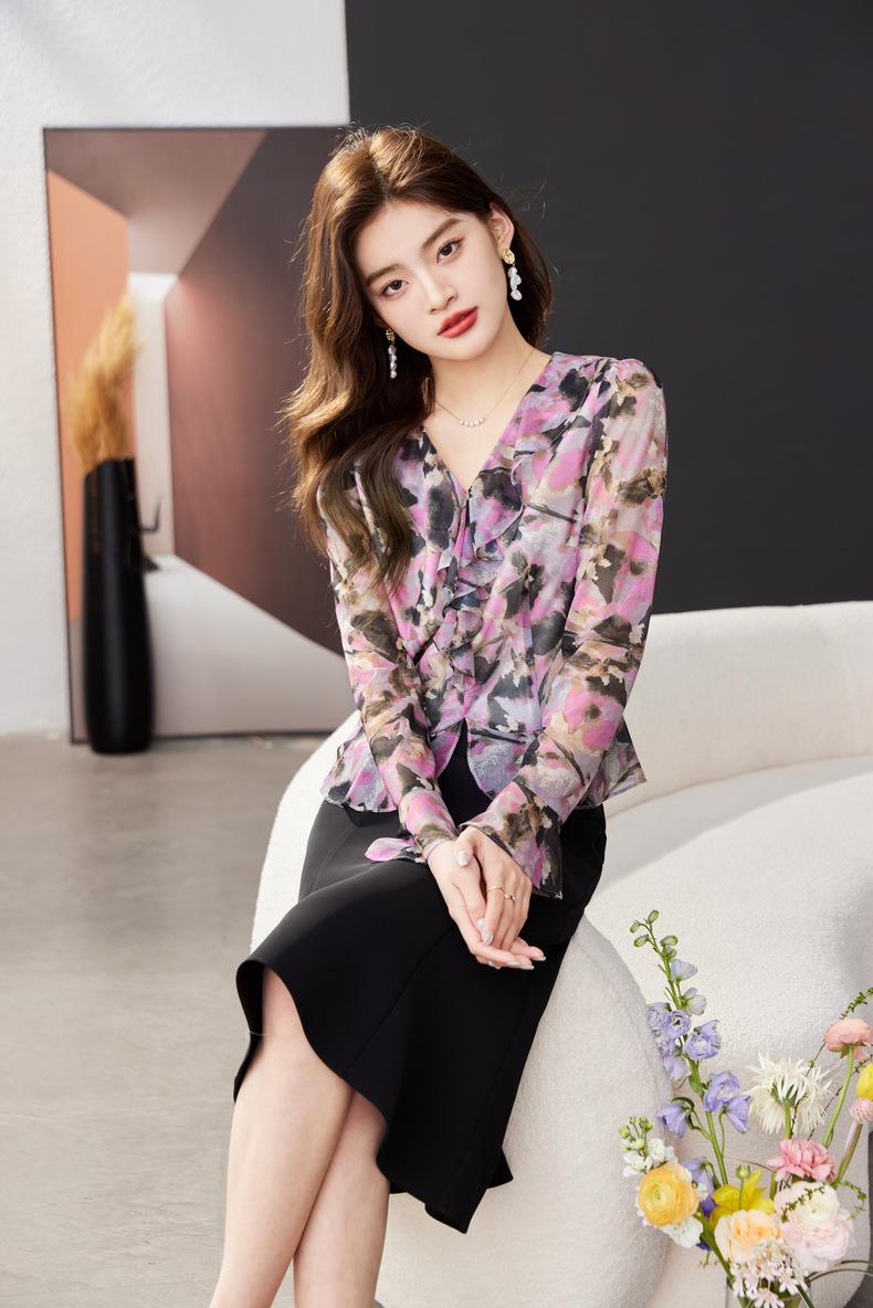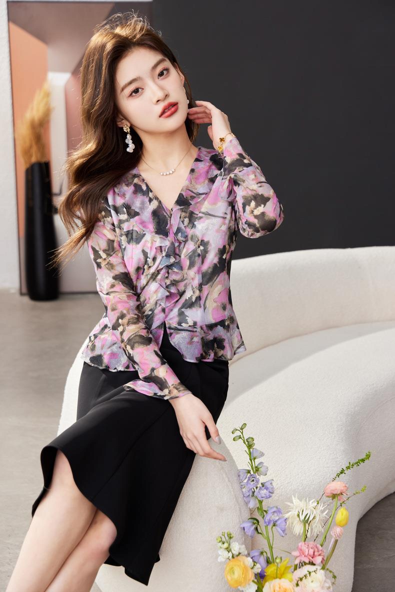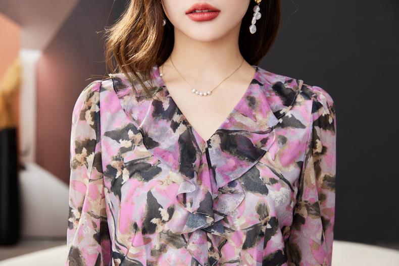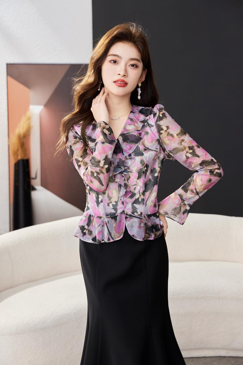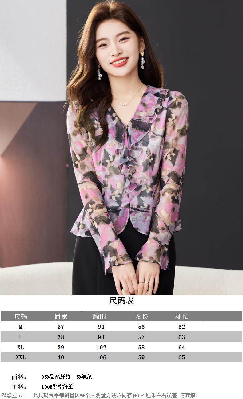 荷叶边碎花雪纺衫女2024春装新款洋气小衫长袖女衬衣1765