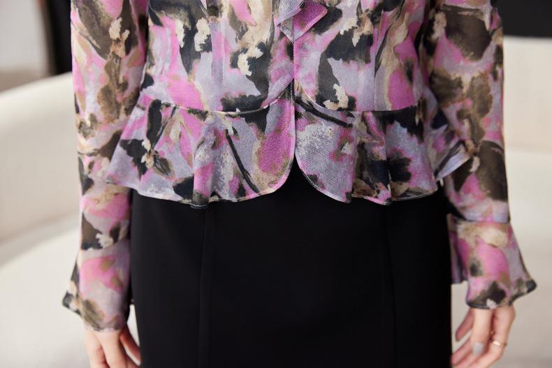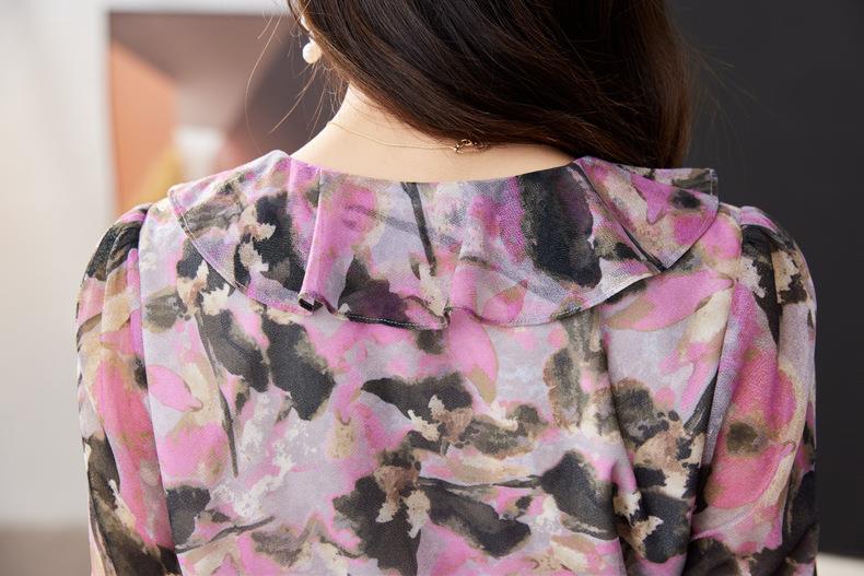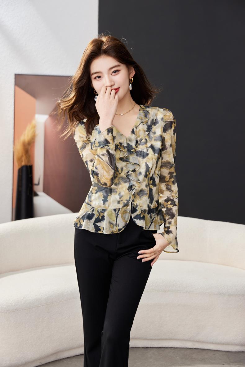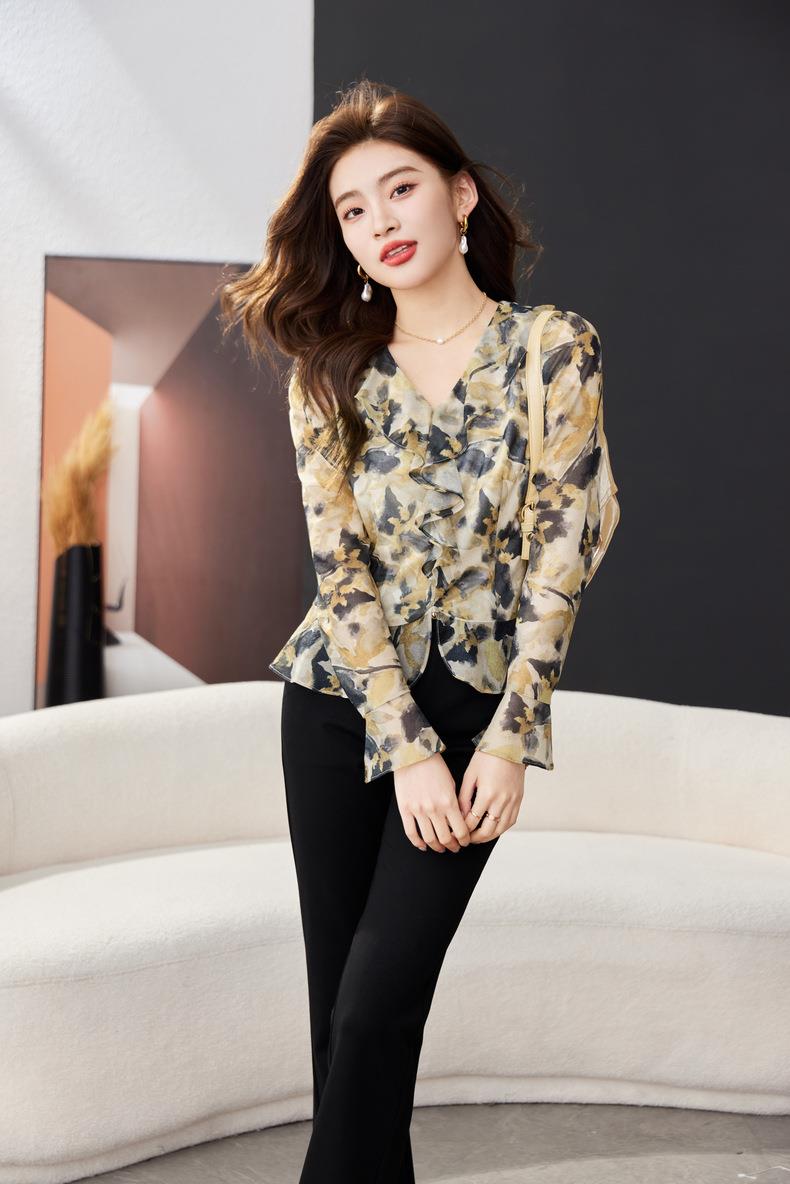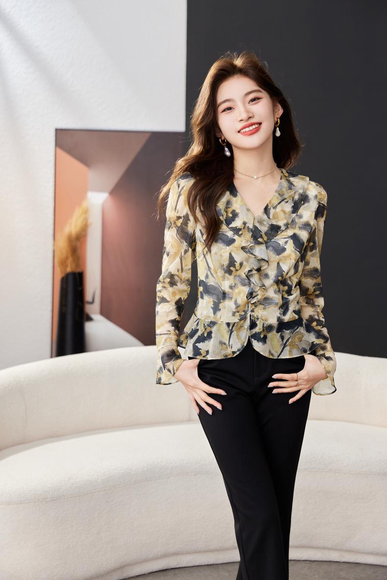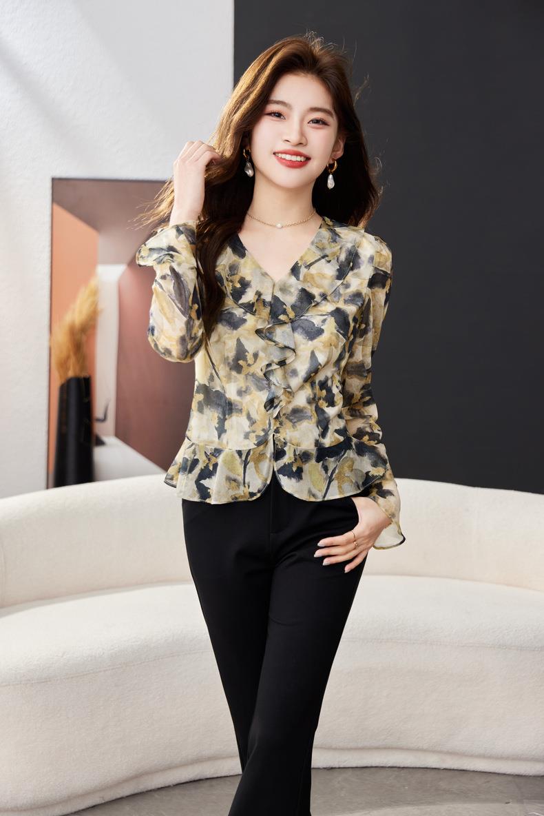 荷叶边碎花雪纺衫女2024春装新款洋气小衫长袖女衬衣1765