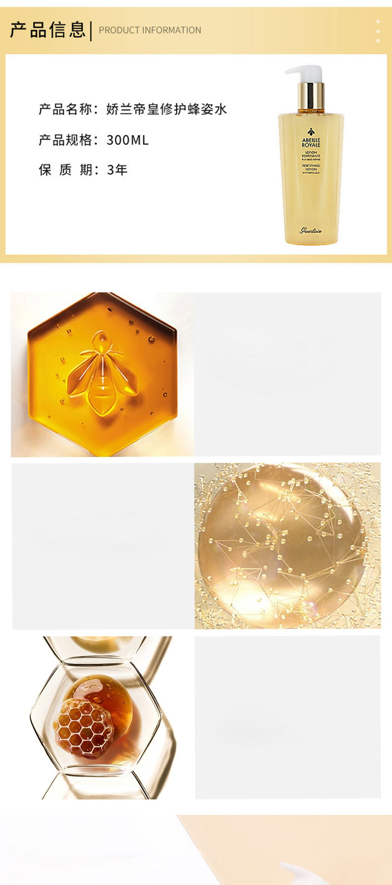 【品牌】Guerlain/娇兰 【商品名称】Guerlain/娇兰帝皇蜂姿精粹水300ML 香港直邮 【规格】:300ml 【有效期】:3年 【产地】:法国 【批次/限用日期】:有效期2027年-1起 【注!!!】批次更新较快,具体以实收批次日期为准 【版本】:免税版 【包装方式】:单独 无塑封 【快递】:韵达快递 【发货地】:香港 【运费模板】: 新疆,宁夏,内蒙古,甘肃+5,其他地区包邮 【不发货地区】:港澳台 西藏 【发货时效】:72小时 【售后政策】:支持七天无理由退换(不影响二次销售的基础上) |