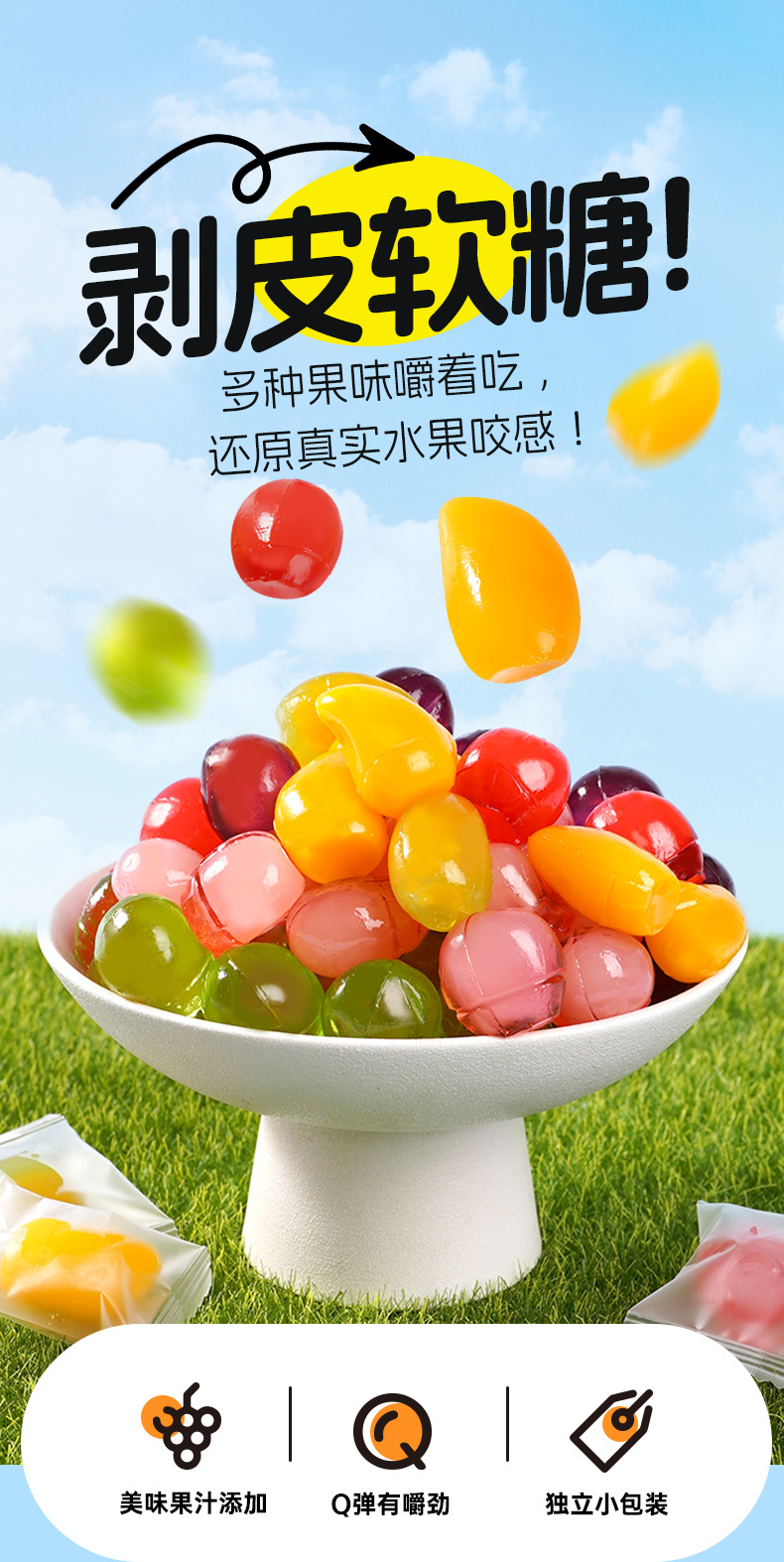 【Q弹有嚼劲!水果剥皮软糖】六款果味HOLD住你的味蕾,0脂的甜蜜,嚼得到的果味,更健康的选择,让你不受热量的束缚,网红3D软糖,水果软糖休闲解压零食L