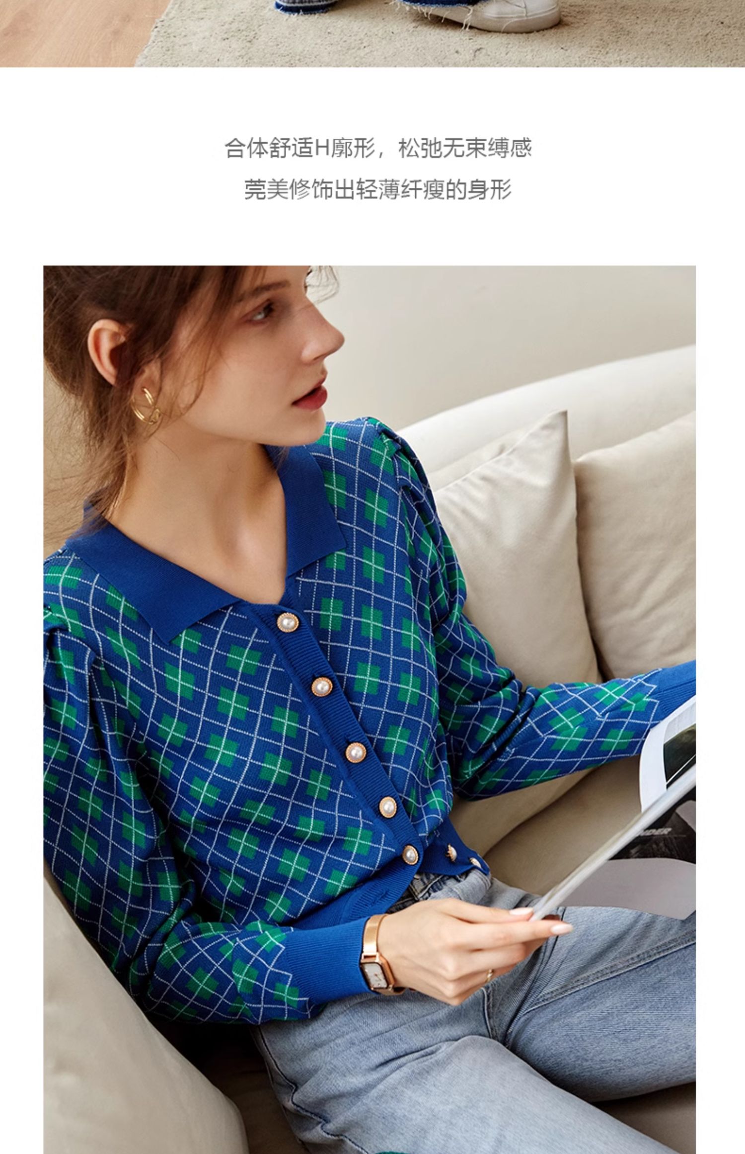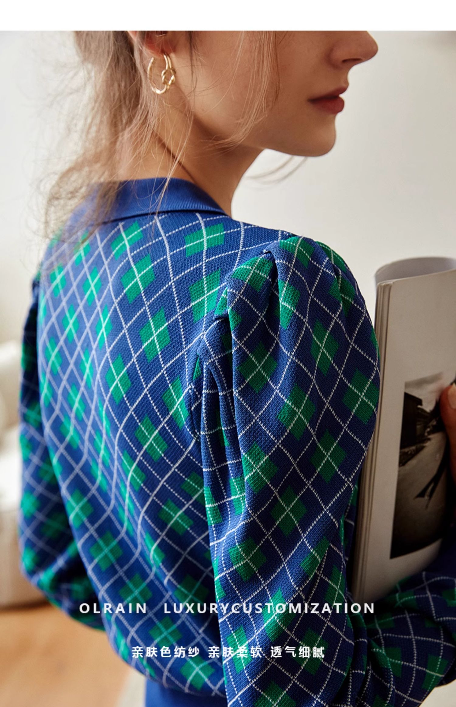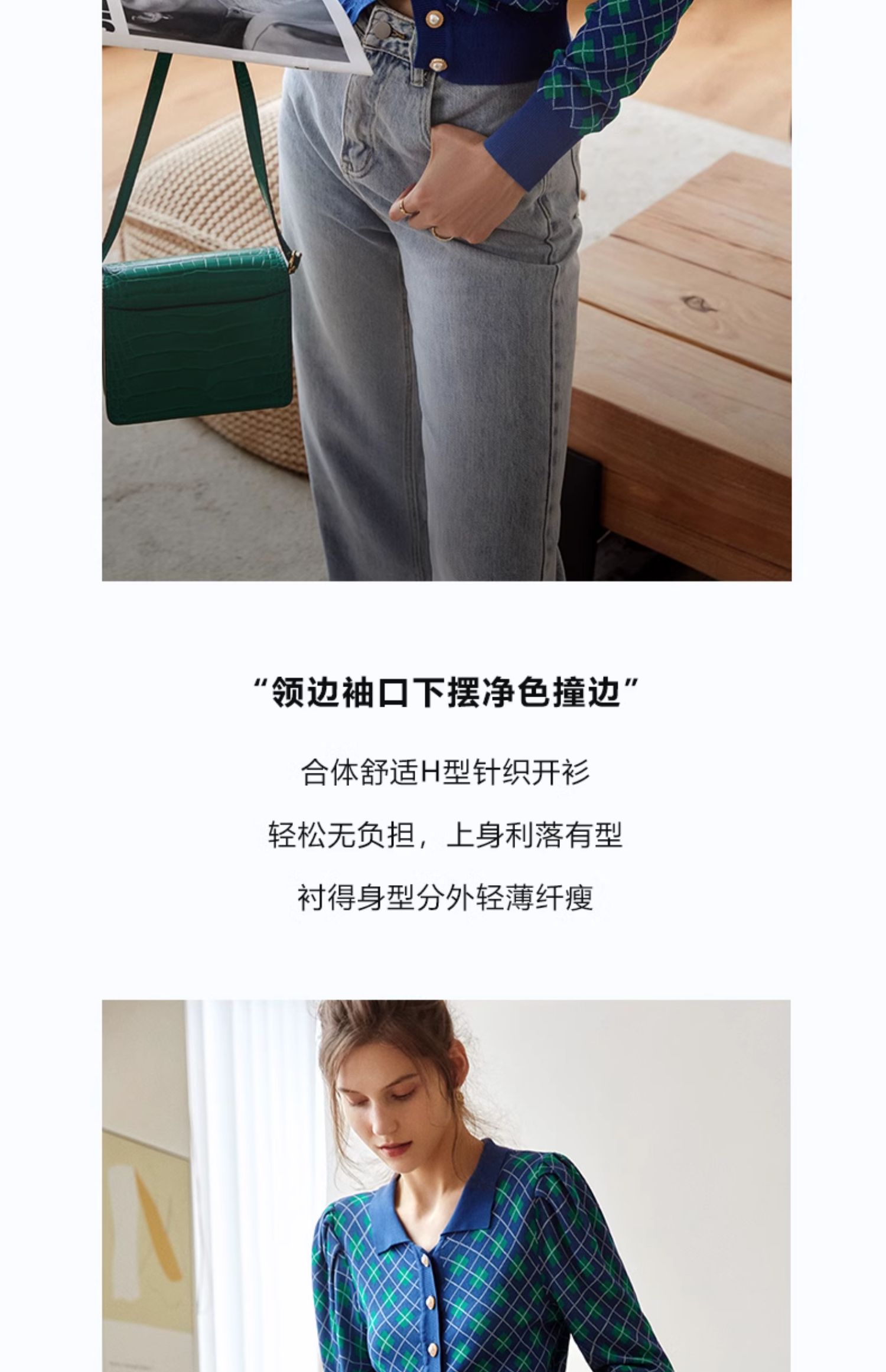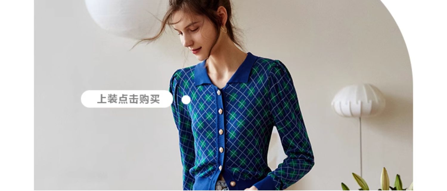 欧芮儿格子开衫毛衣女秋季新款2024修身显瘦法式复古外穿蓝色上衣