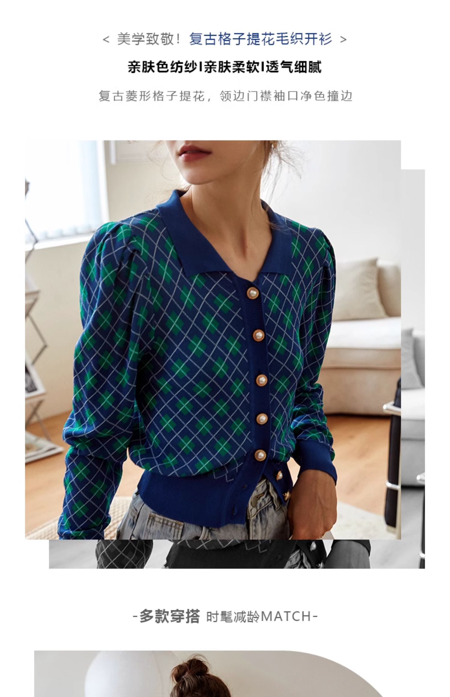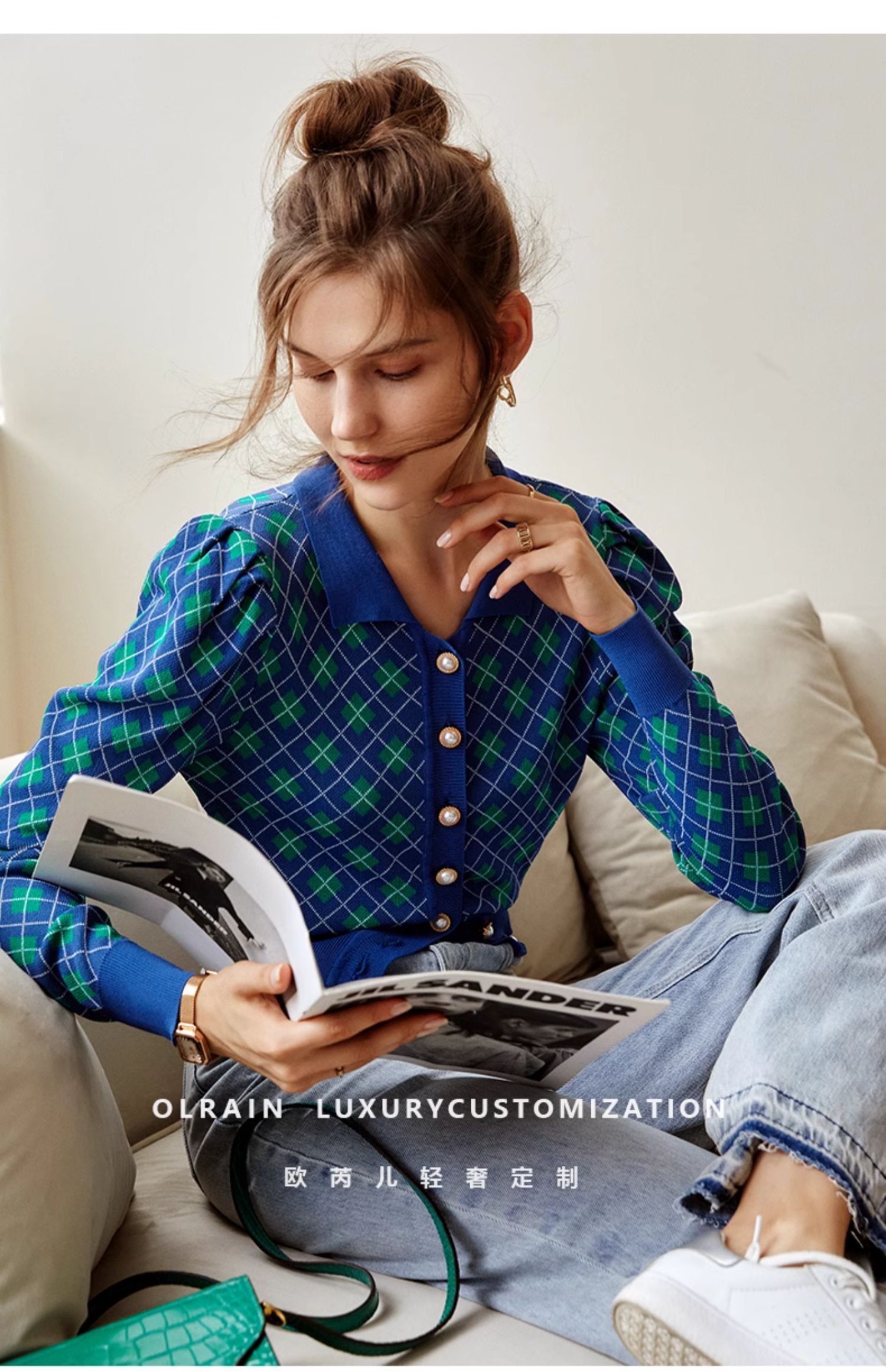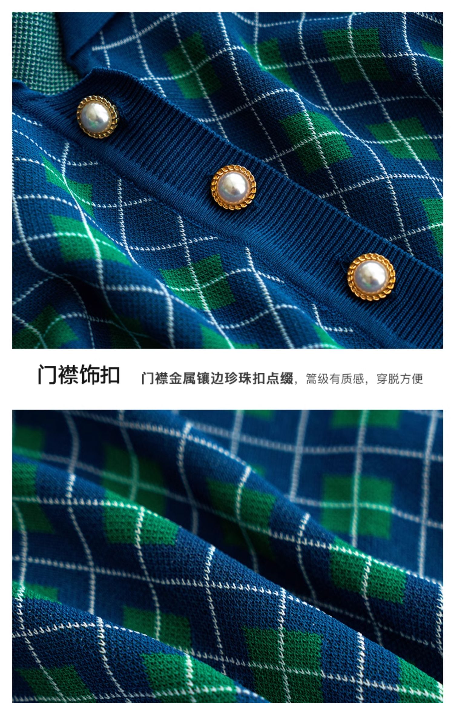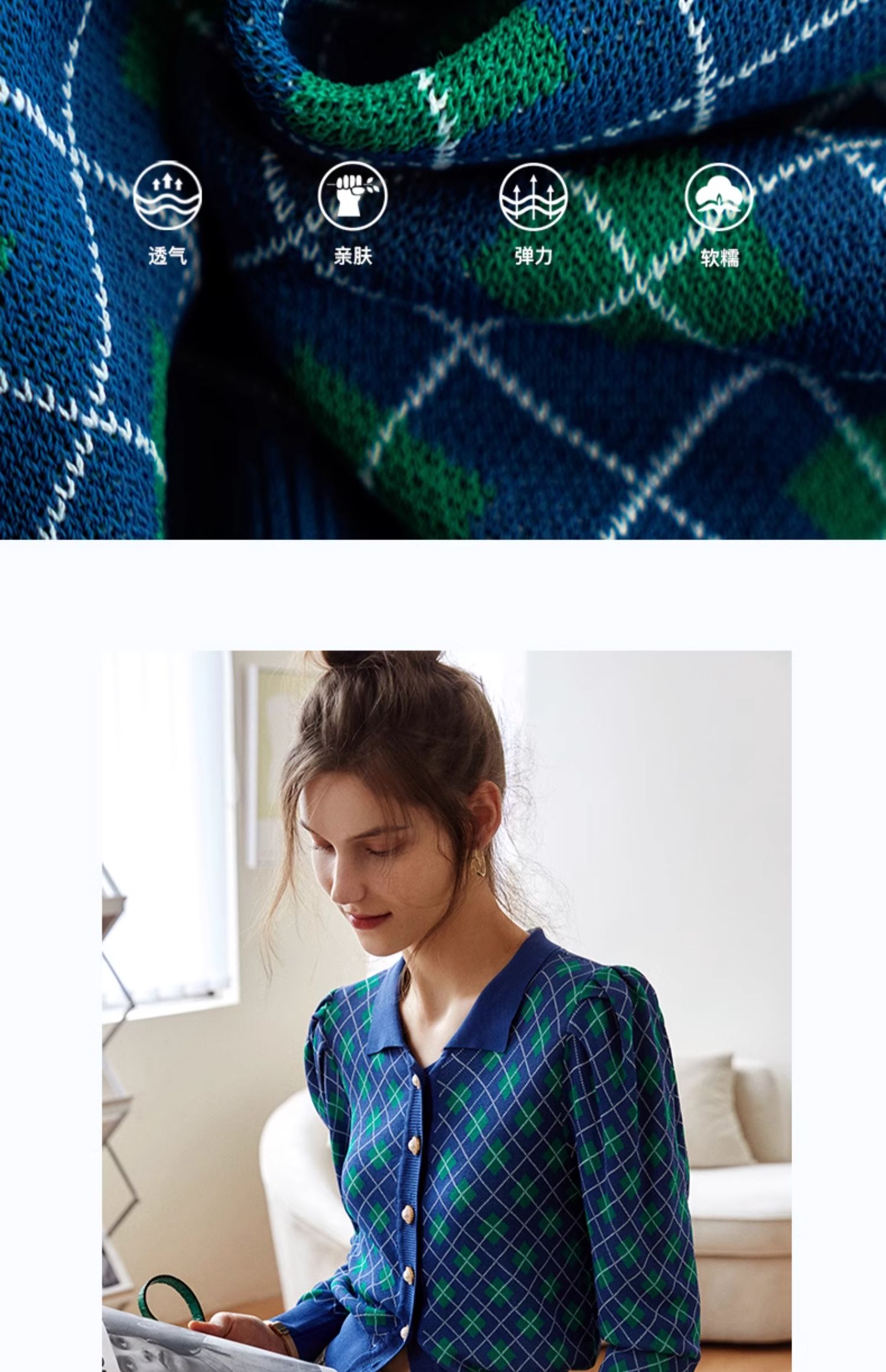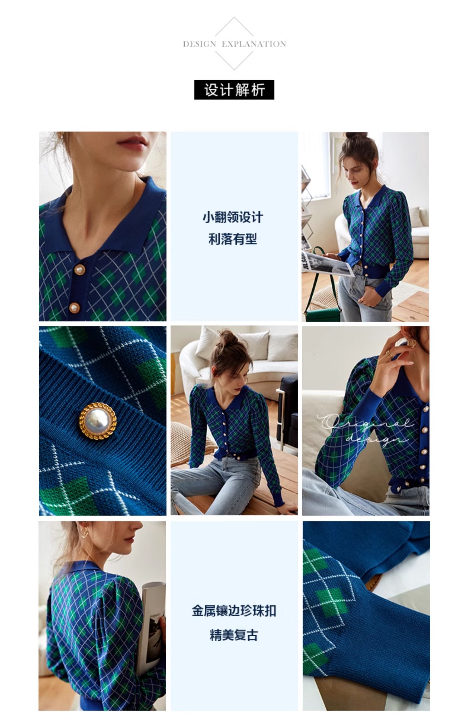 欧芮儿格子开衫毛衣女秋季新款2024修身显瘦法式复古外穿蓝色上衣
