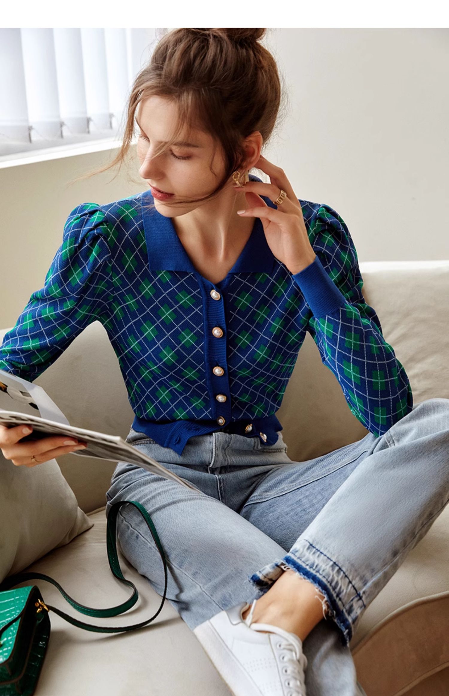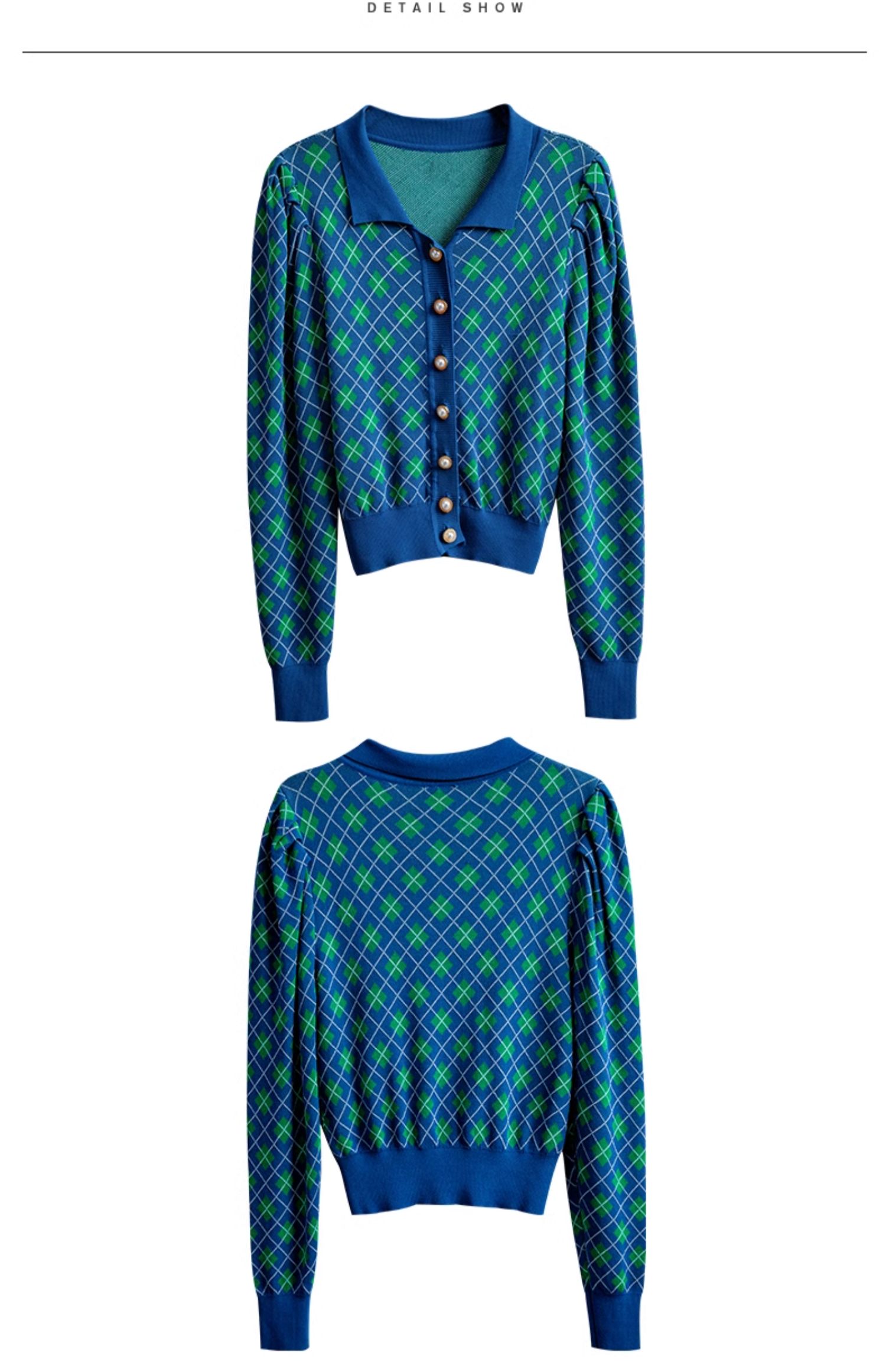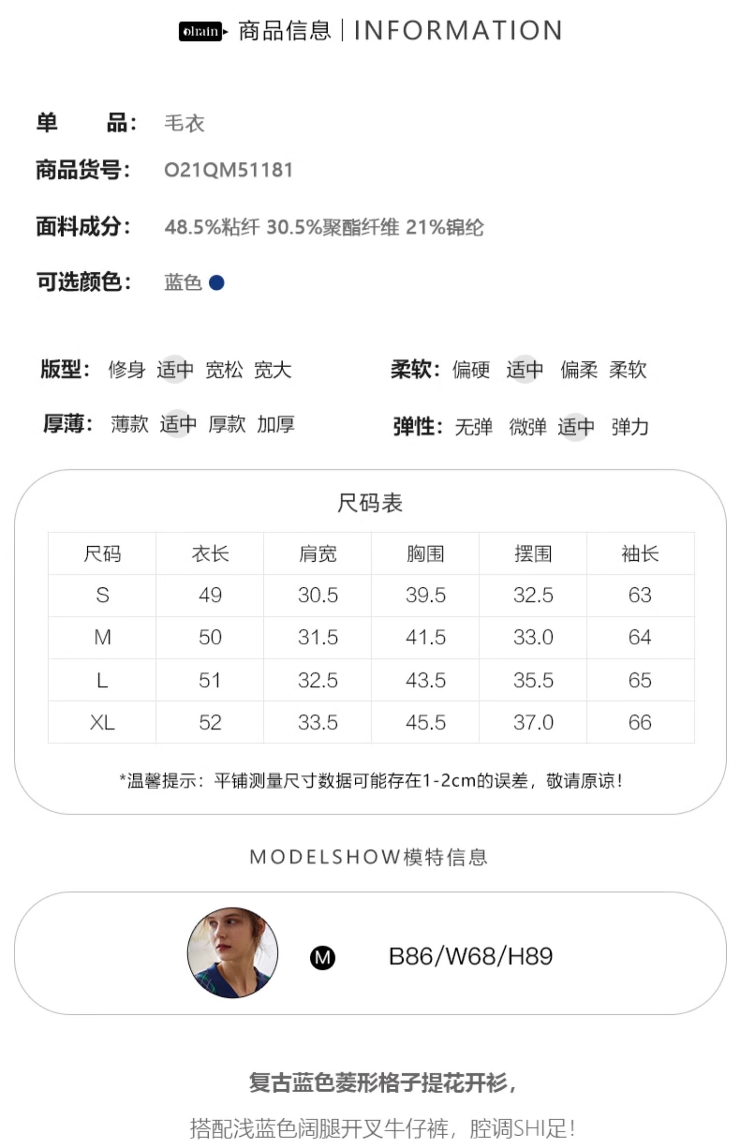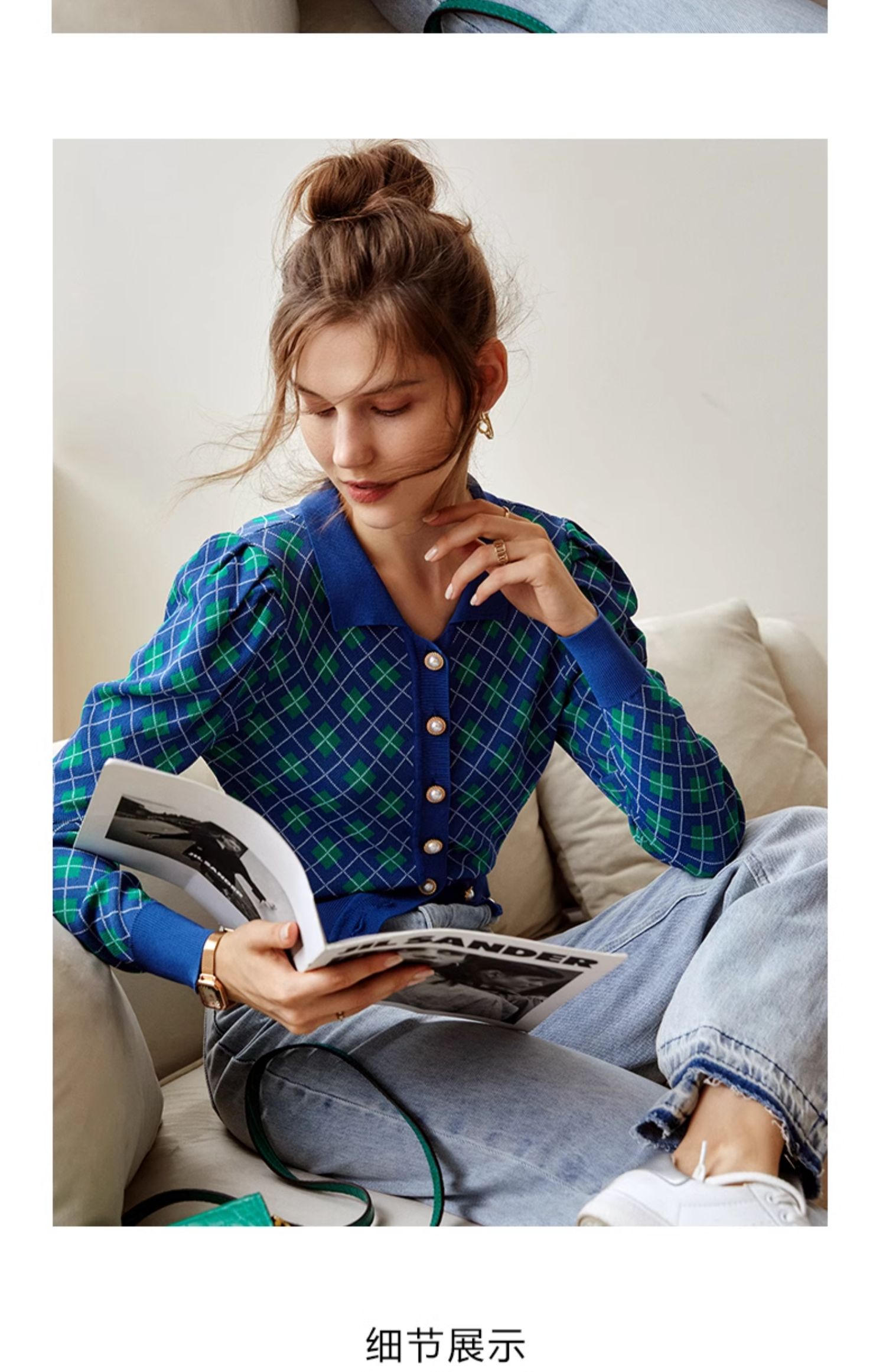 欧芮儿格子开衫毛衣女秋季新款2024修身显瘦法式复古外穿蓝色上衣