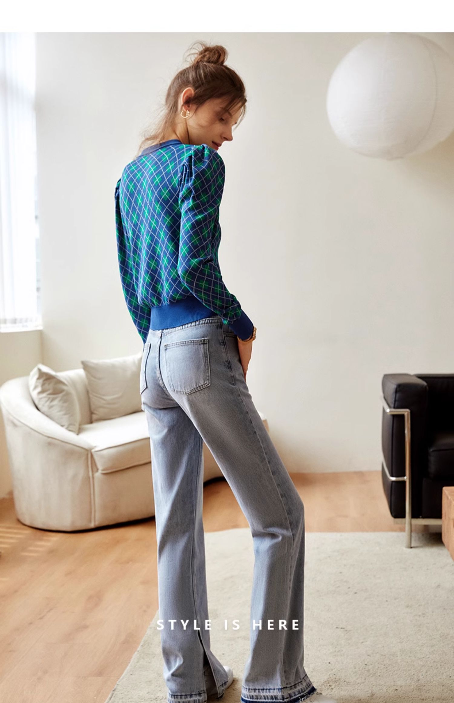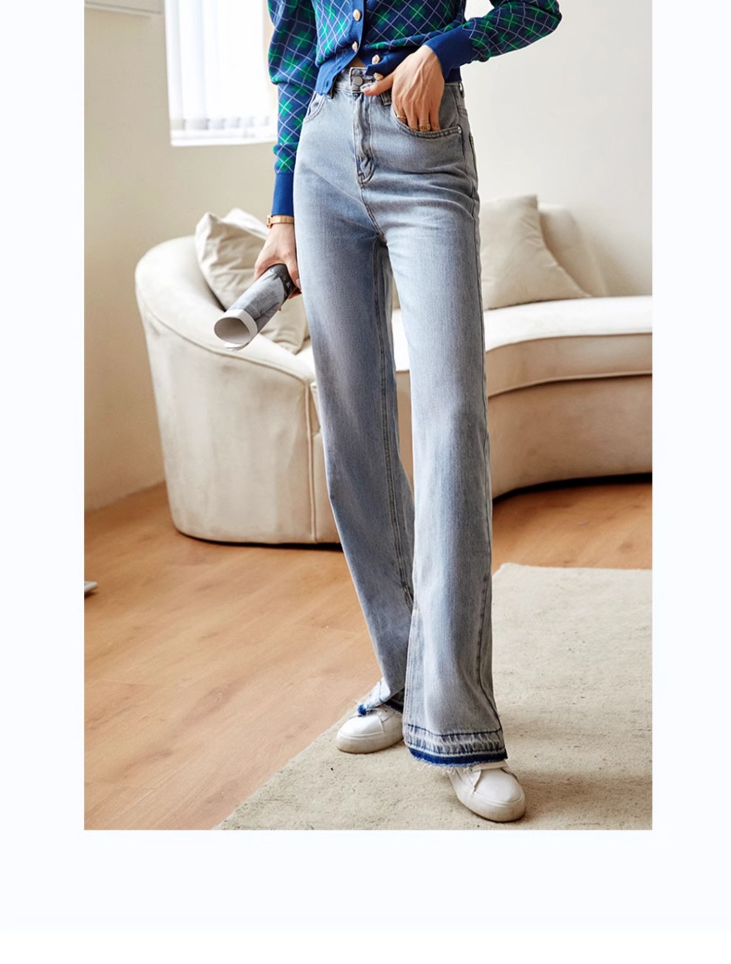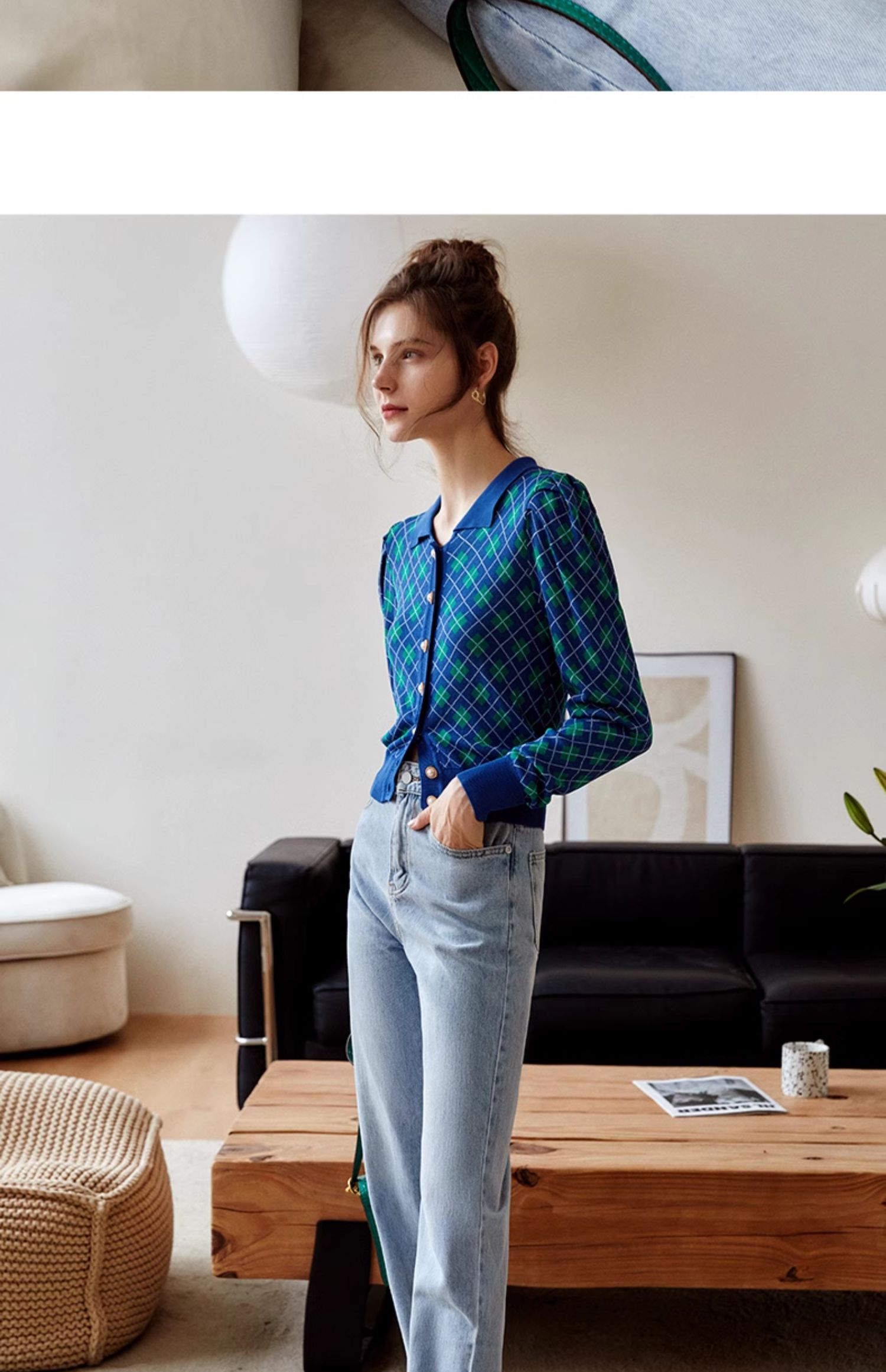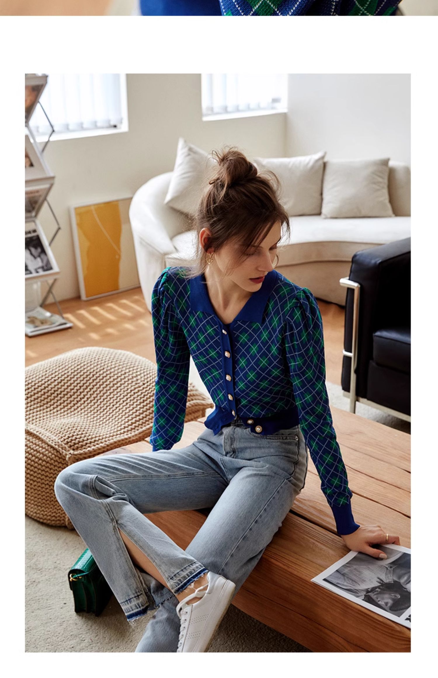 欧芮儿格子开衫毛衣女秋季新款2024修身显瘦法式复古外穿蓝色上衣