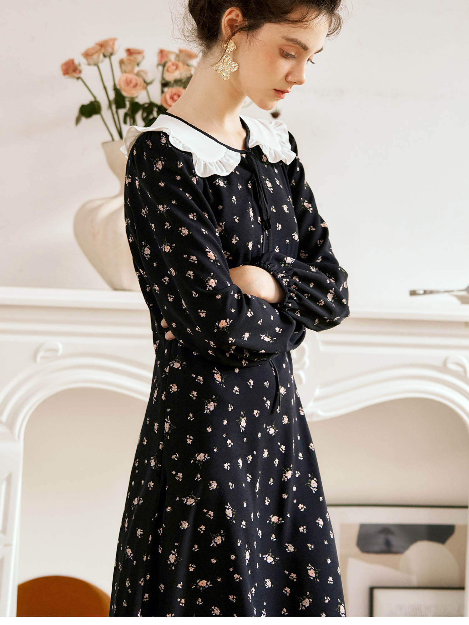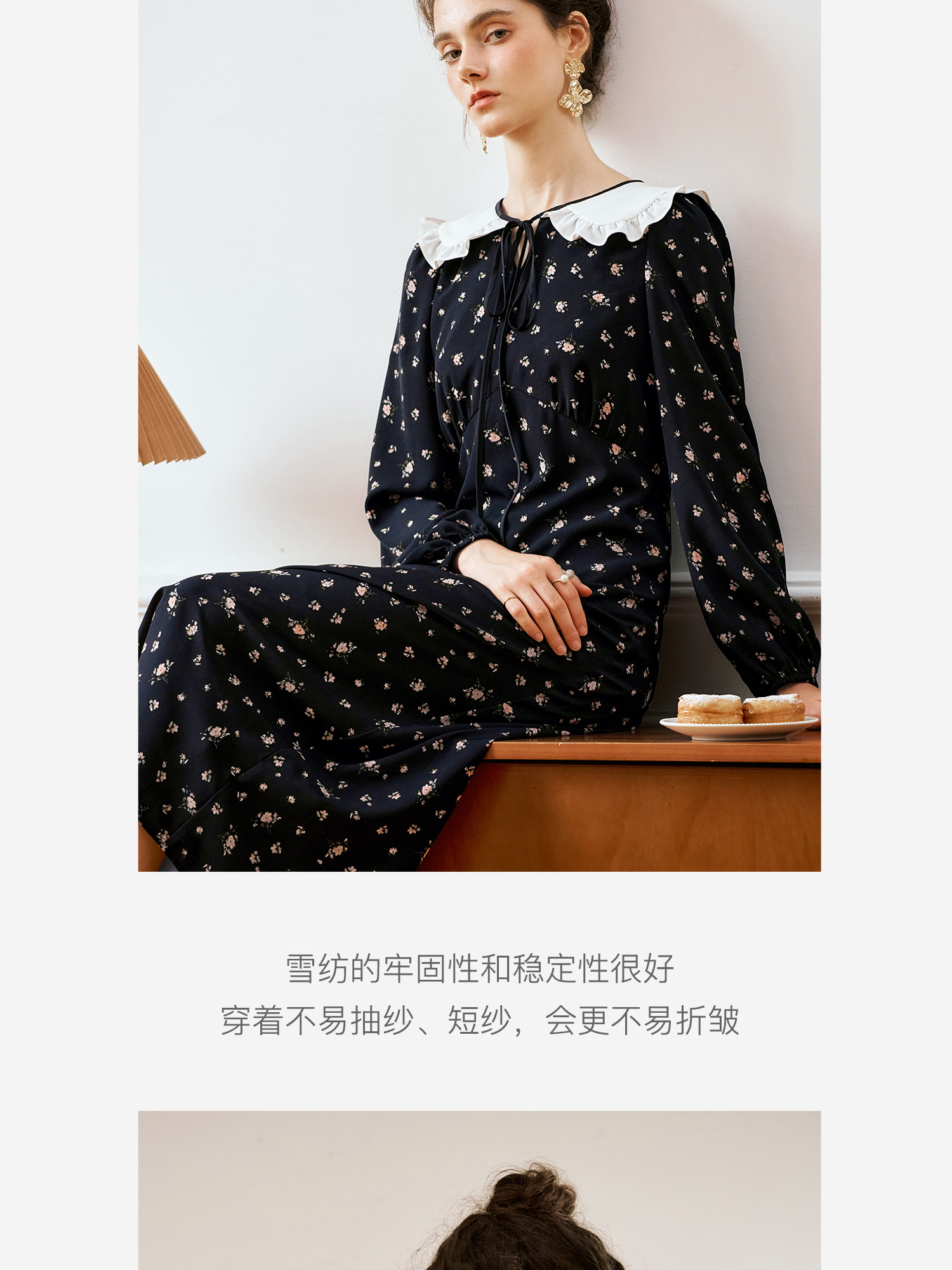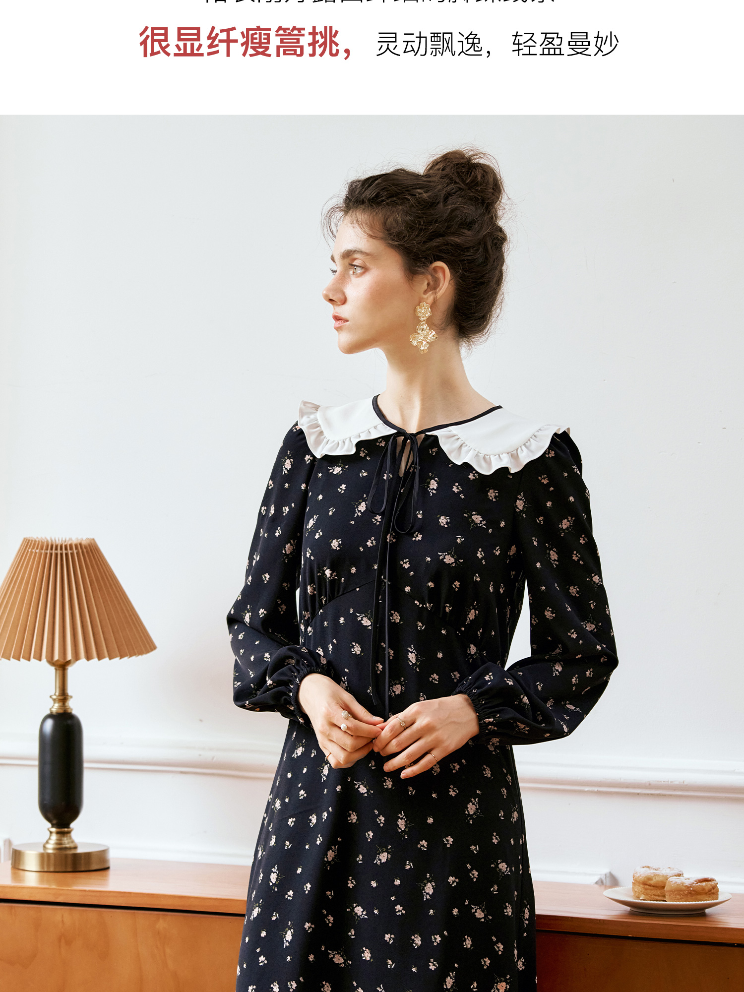 OLrain欧芮儿法式连衣裙女秋季2024年新款碎花雪纺娃娃领长袖裙子