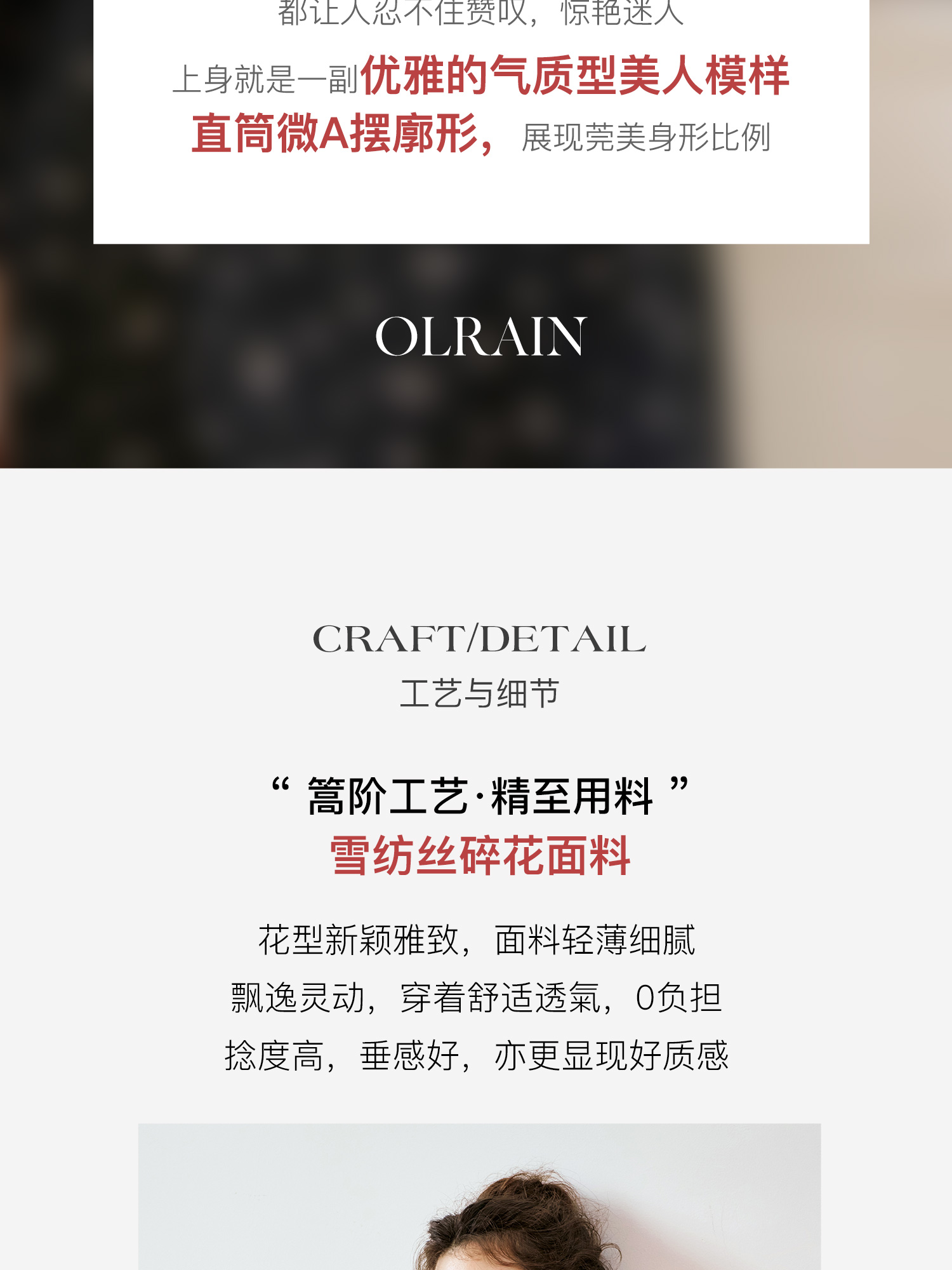 - “精致”是欧芮儿olrain品牌文化的核心,欧芮儿认为,精致的女人,不但要外在动人,更要内在迷人,内外兼修,有魅力、有气质、有内涵,自信而不自傲,优雅而不矫揉,自有万种风情而不轻浮,更不故作矜持。