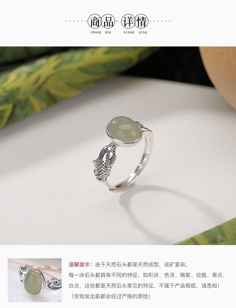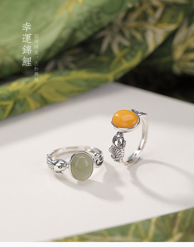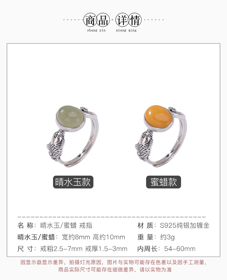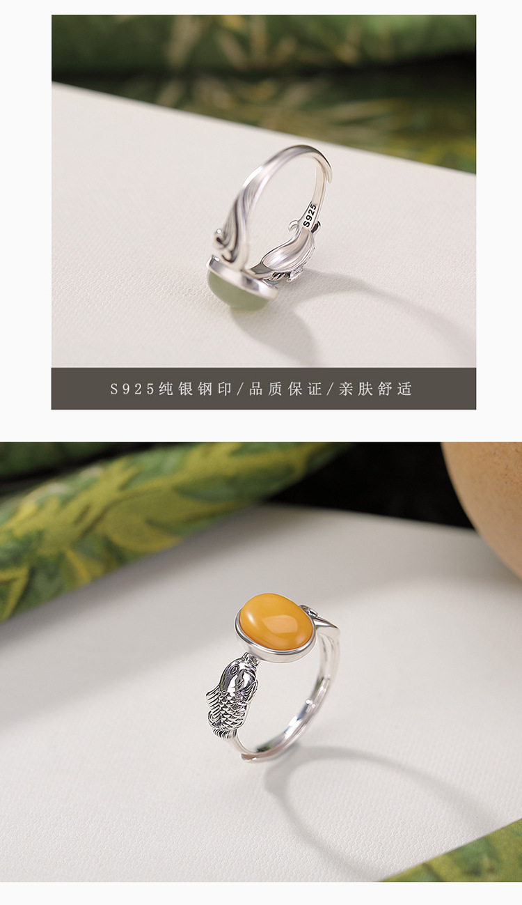 【云游锦鲤】S925纯银和田玉晴水玉蜜蜡锦鲤鲤鱼开口戒指【CW-JZ07574】