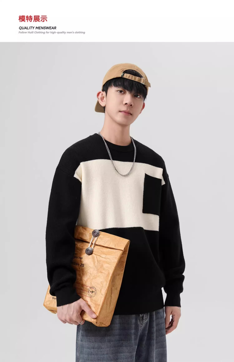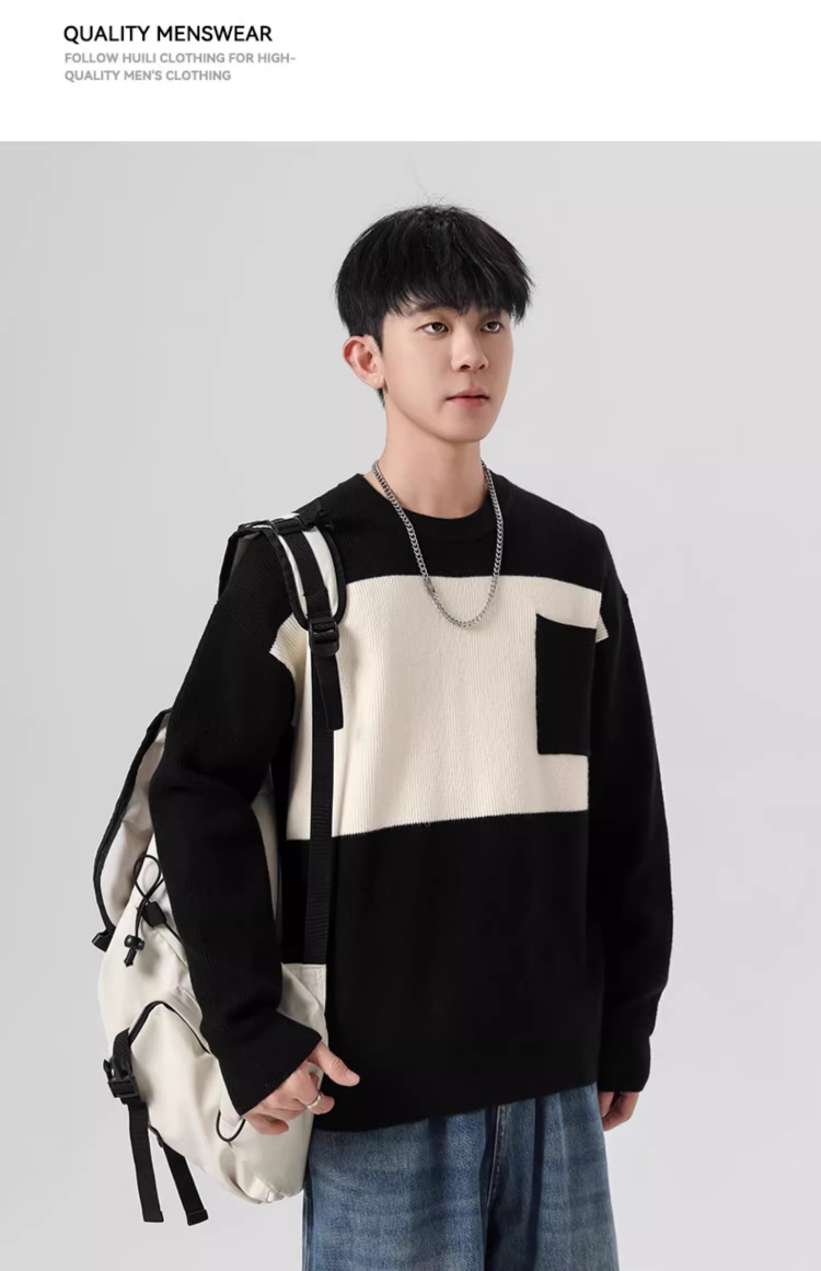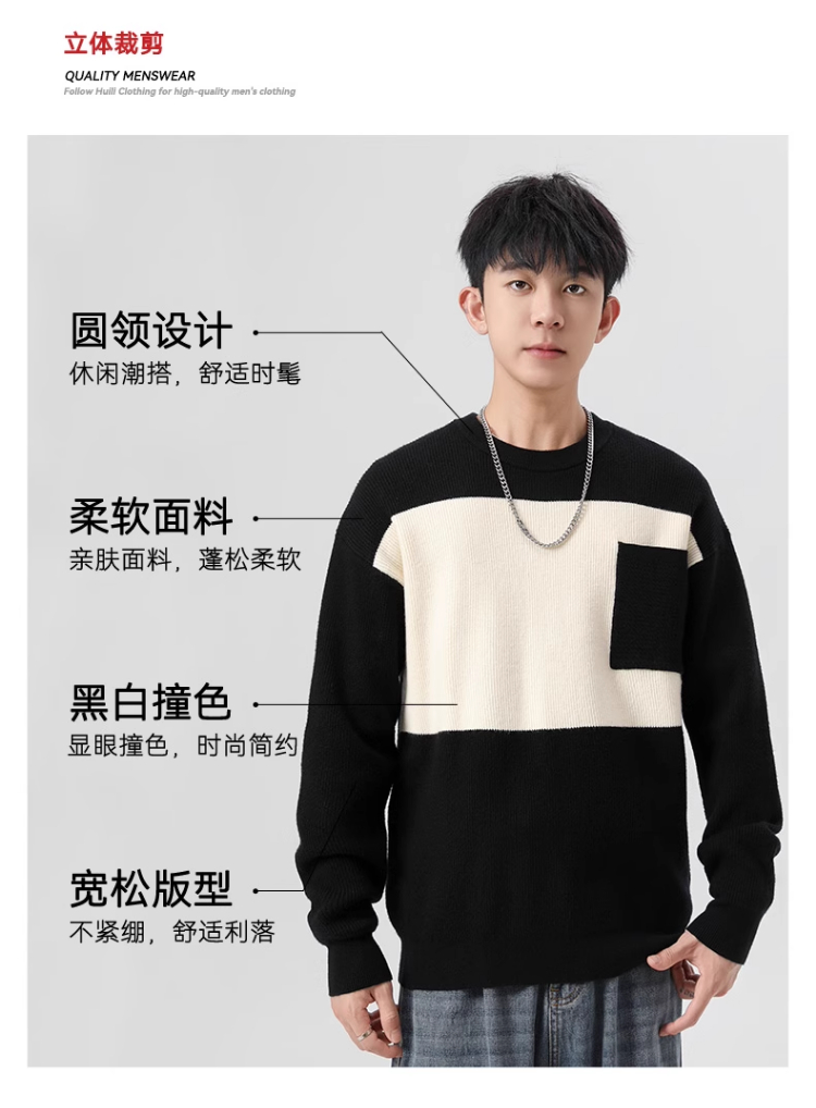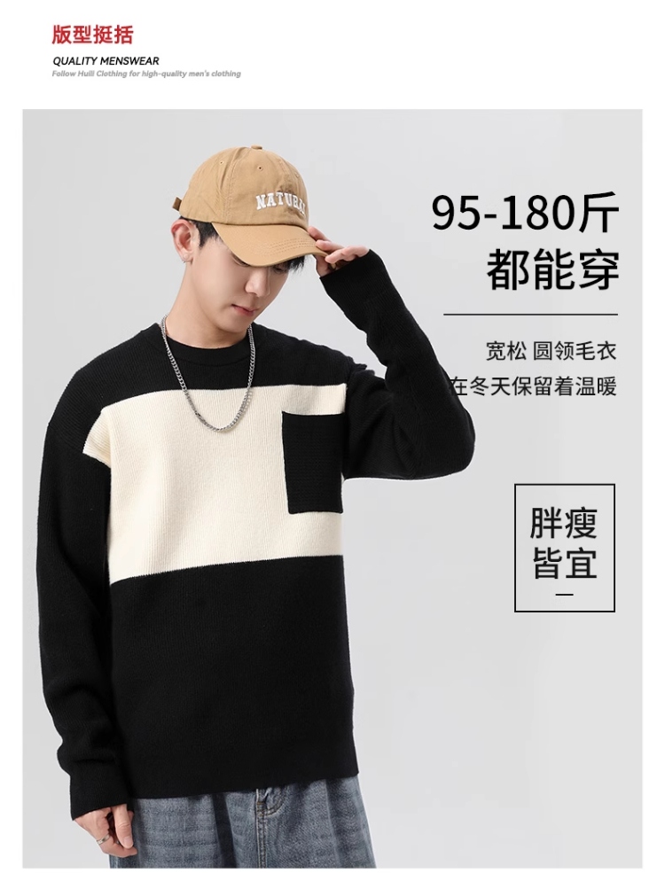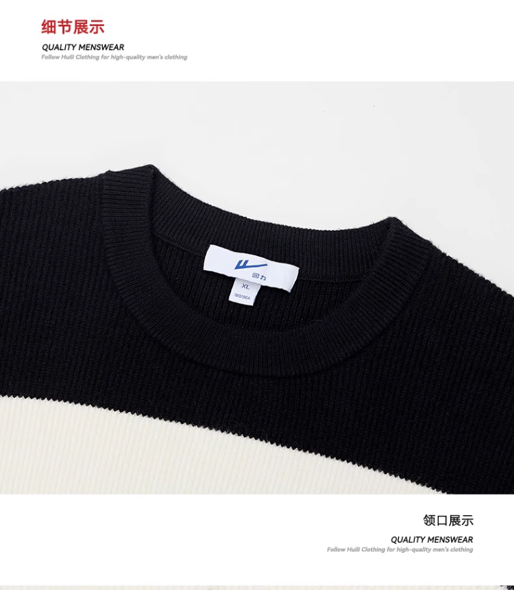 回力毛衣男2025秋冬新款潮流黑白撞色宽松套头保暖上衣内搭针织衫