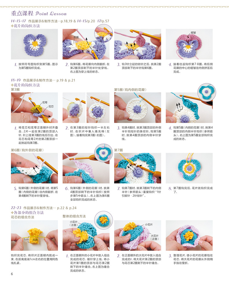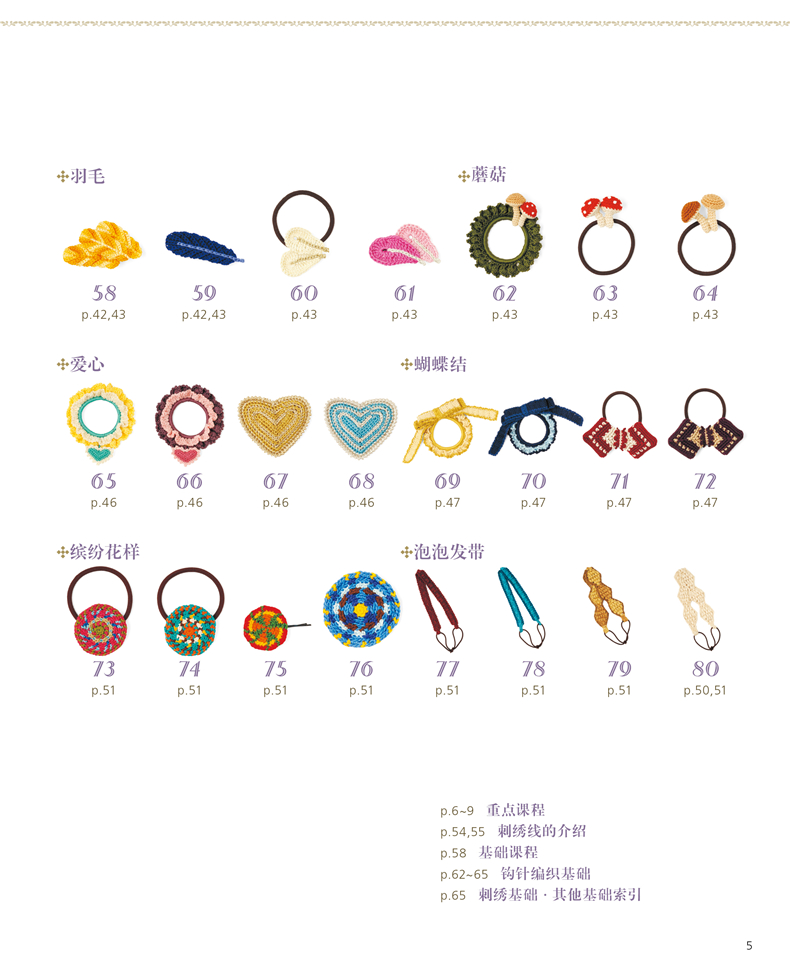 ·在基础课程和重点课程两个章节中介绍了书中用到的所有针法和实用基础,非常适合初学者。