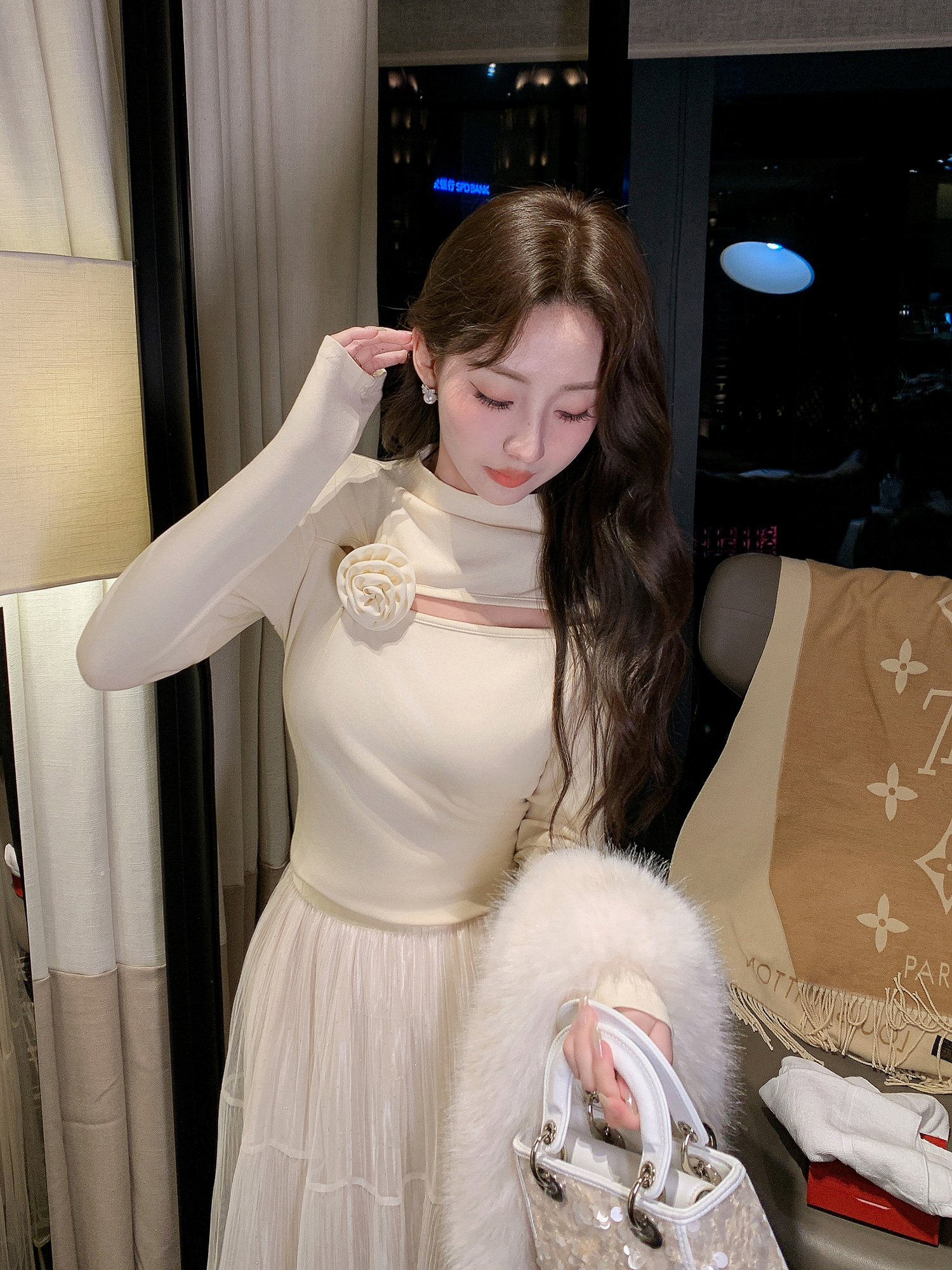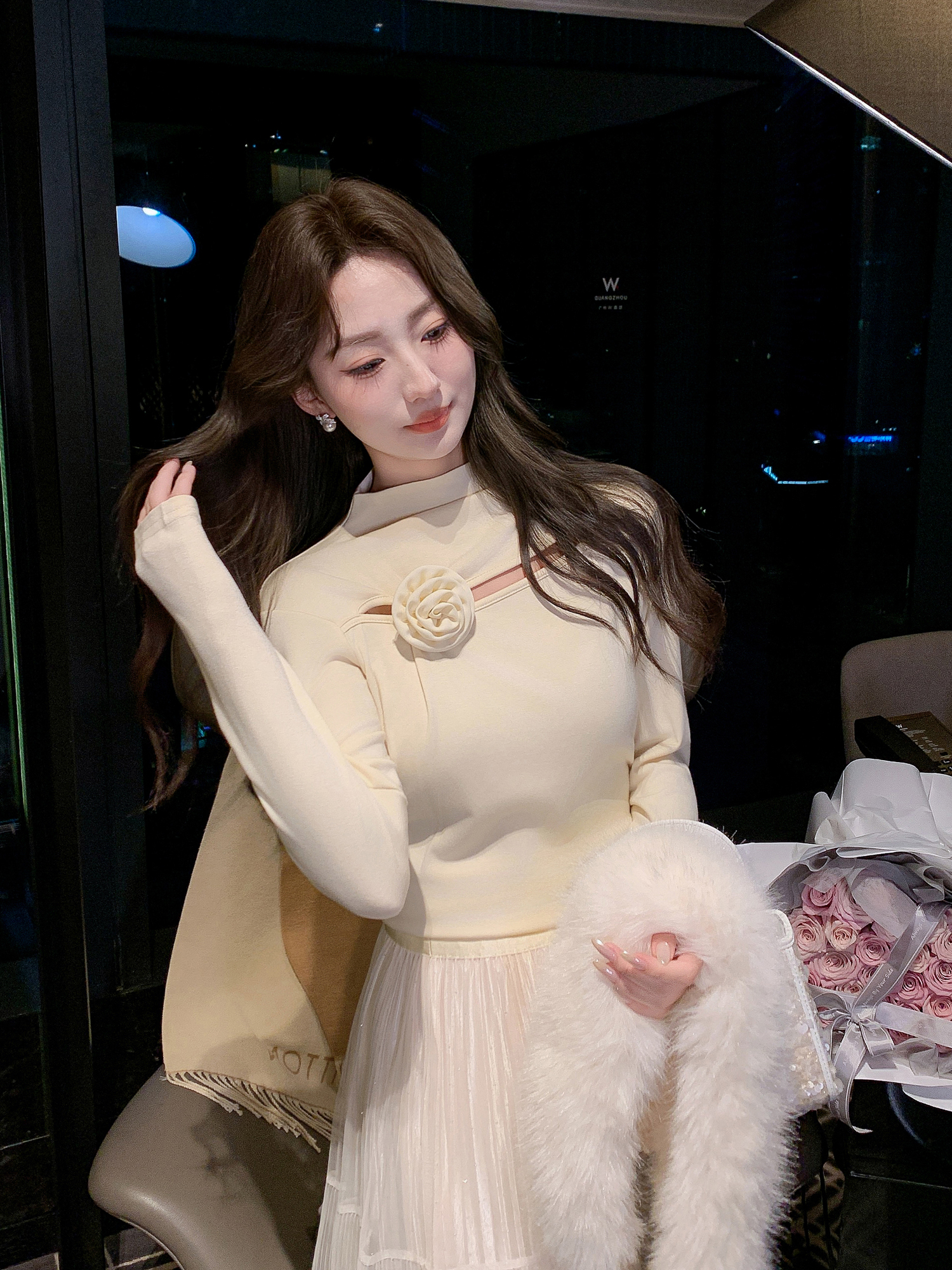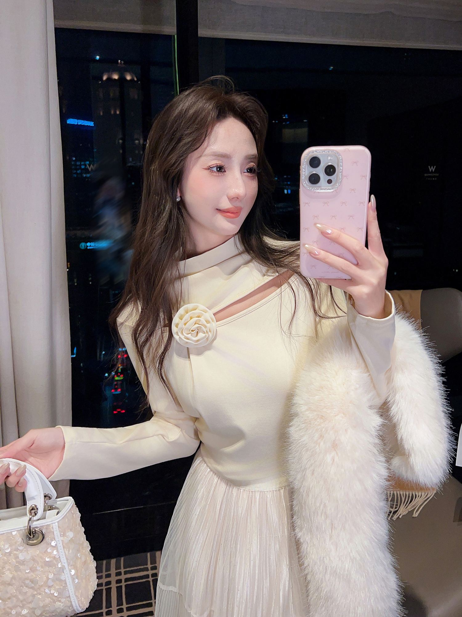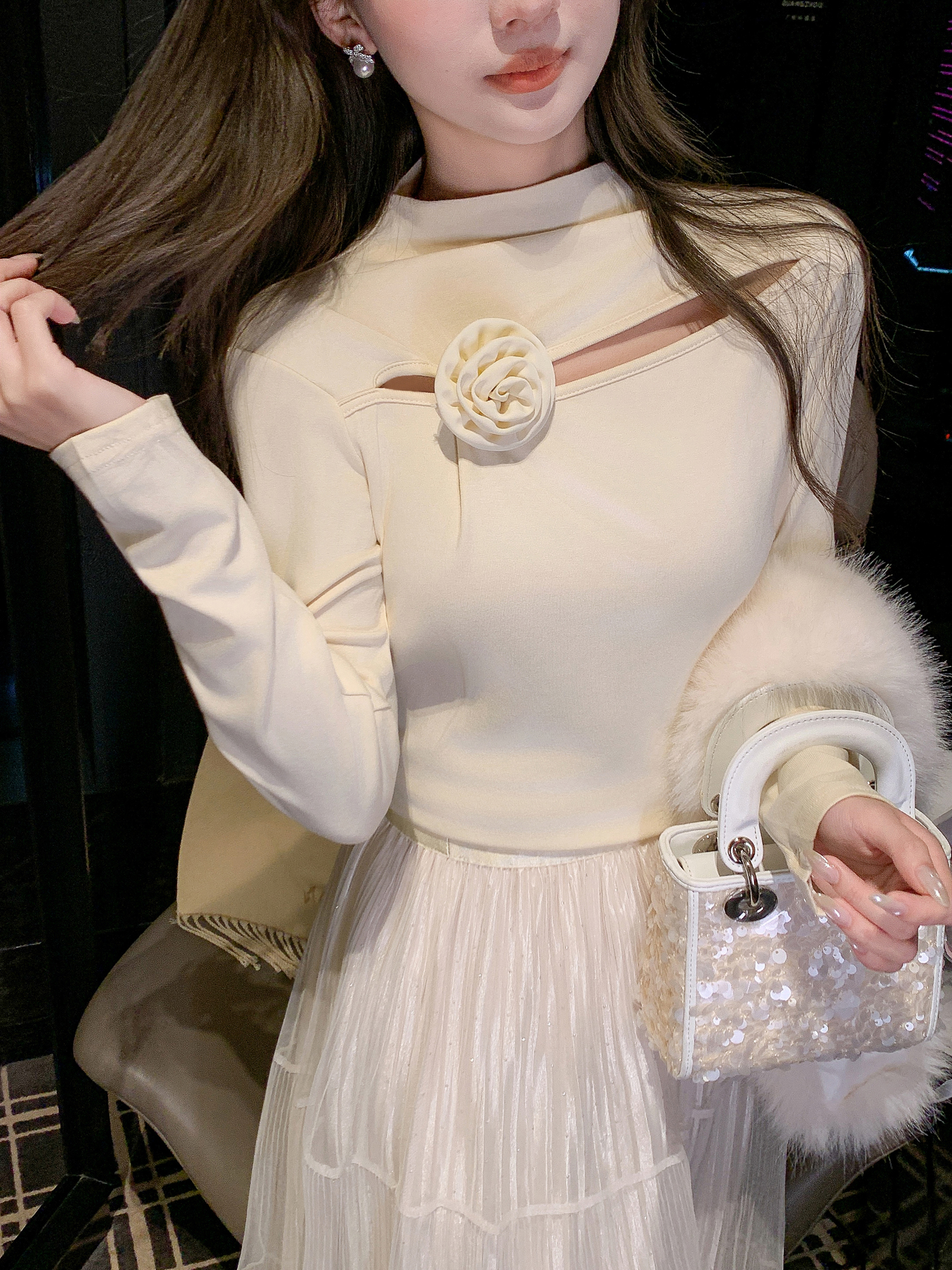 张心子【温暖呼吸】加厚磨毛挖空心机打底衫别致扭结长袖上衣 U2601027