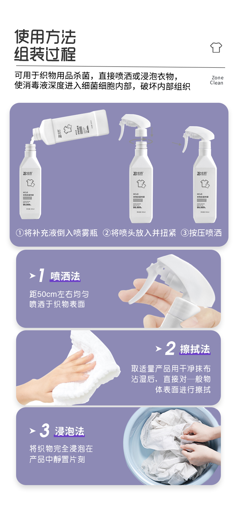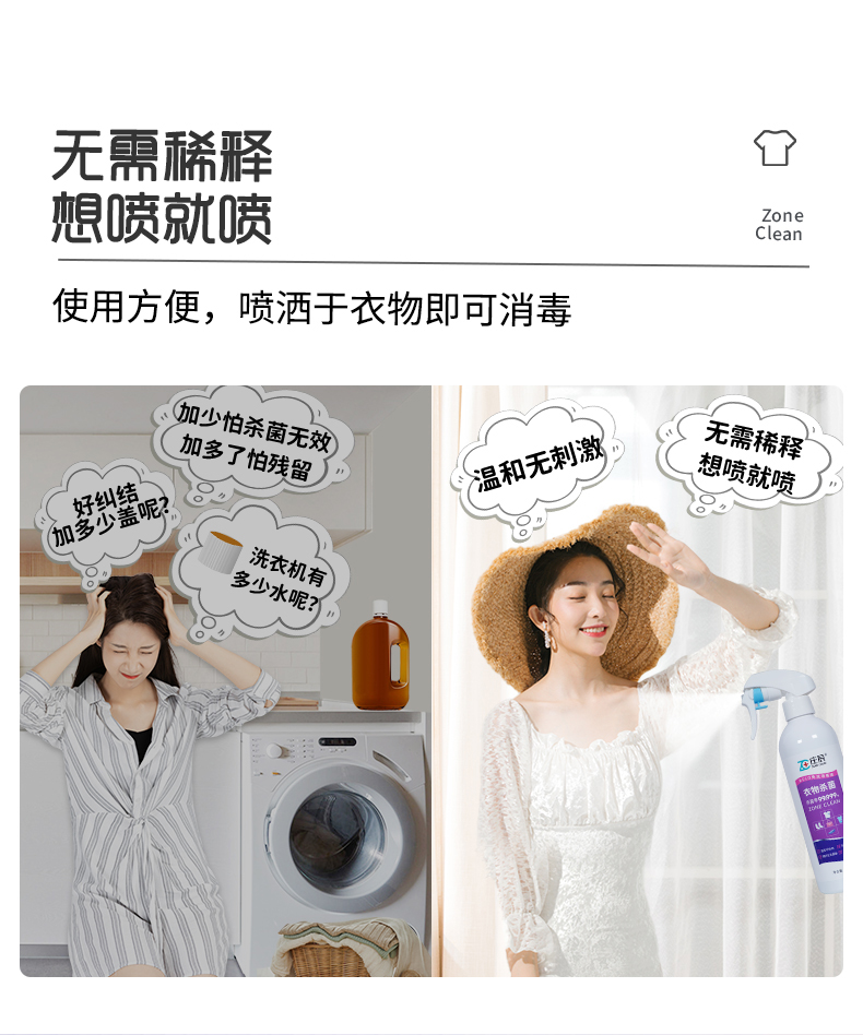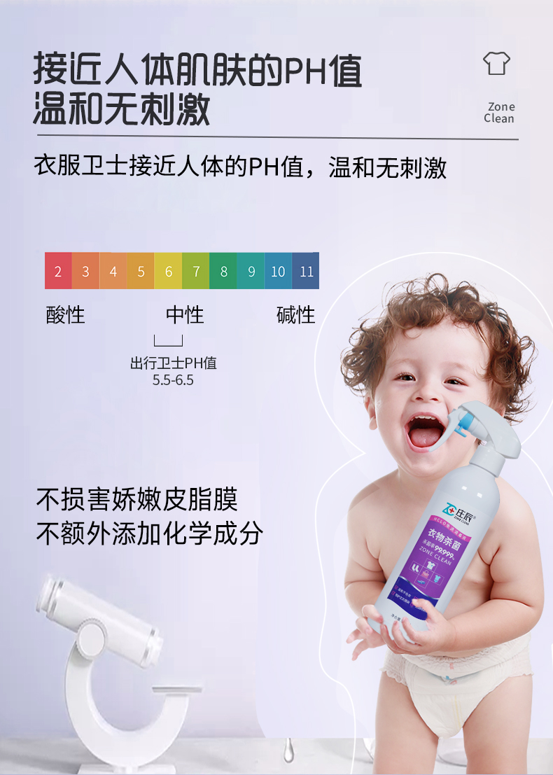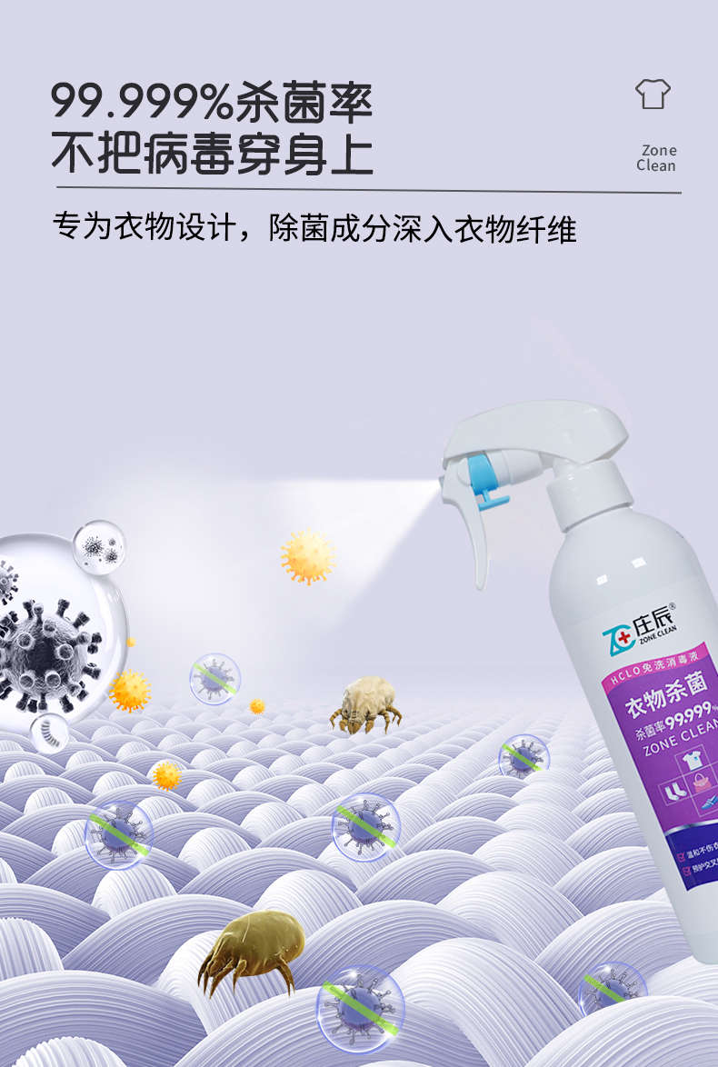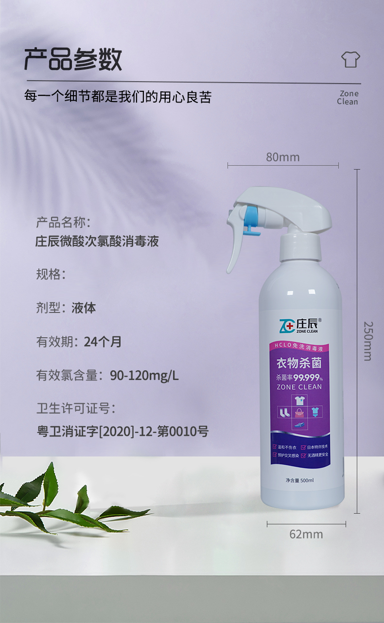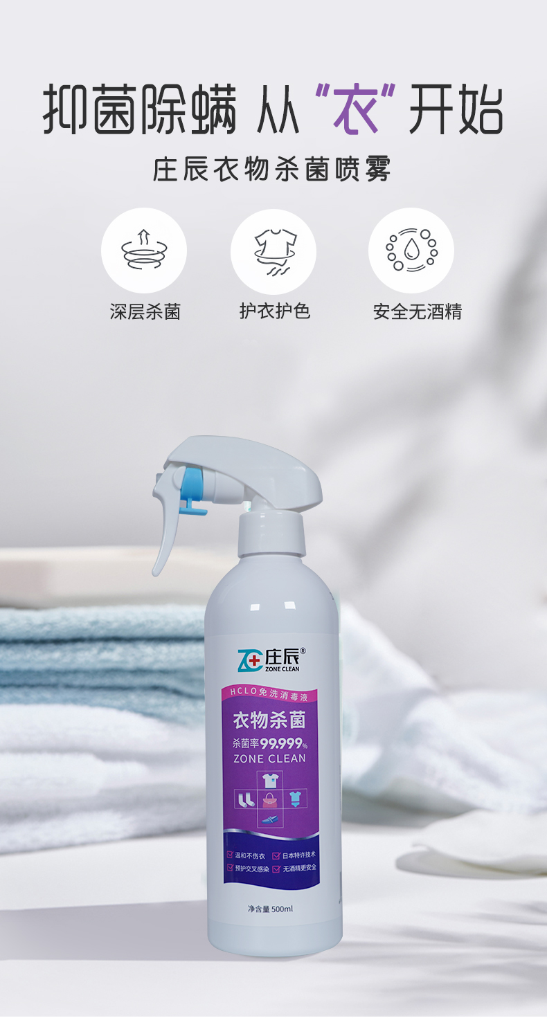 庄辰 衣物杀菌HCLO免洗消毒液 500ml 祛除异味 次氯酸灭菌 温和亲肤