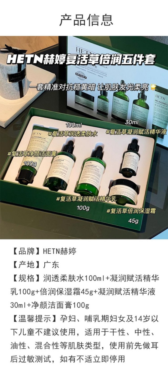 HETN赫婷复活草倍润五件套😄 ✅ 蕴含复活草等多种天然植物精华 滋养肌肤 ✅修护肌肤屏障,滋养保湿,改善粗糙 ✅补水保湿,改善肌肤干燥缺水状态 ✅提亮肤色,改善暗沉,焕发肌肤光彩