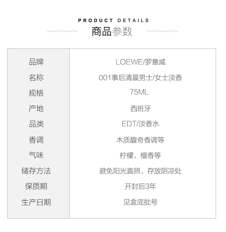 【中欧班列精选】 LOEWE/罗意威001事后清晨香水30ml/50ml/100ml1LPY