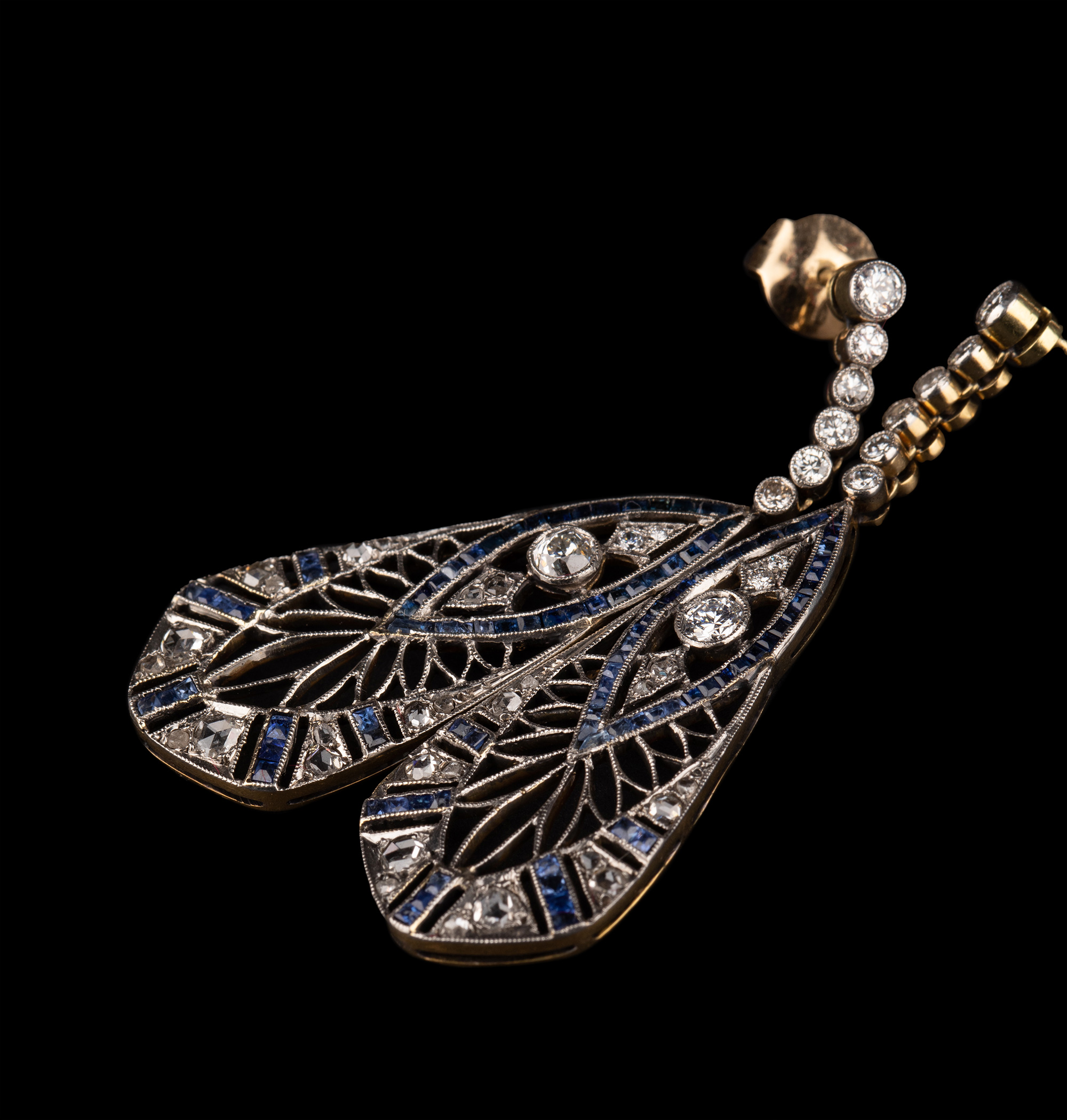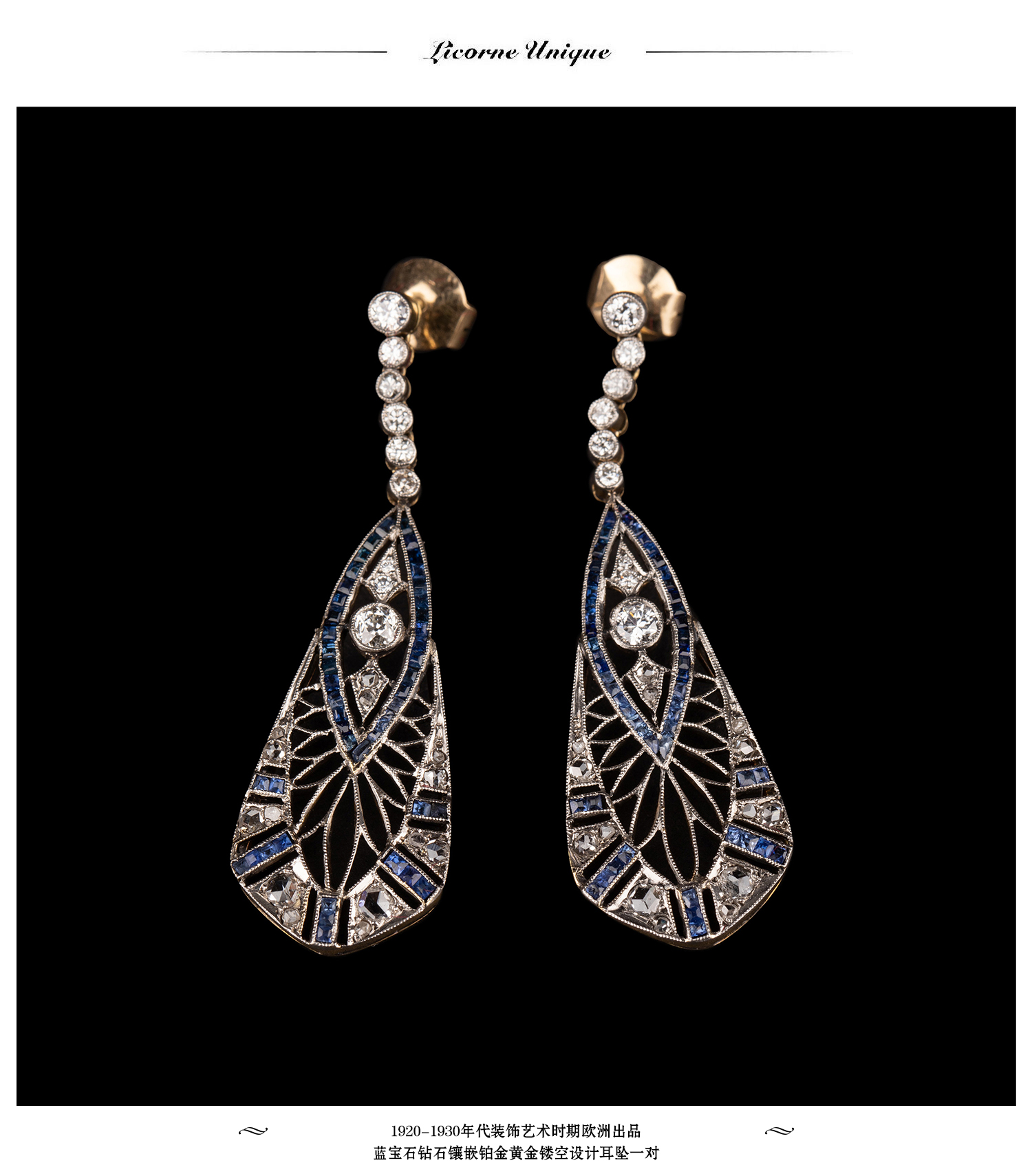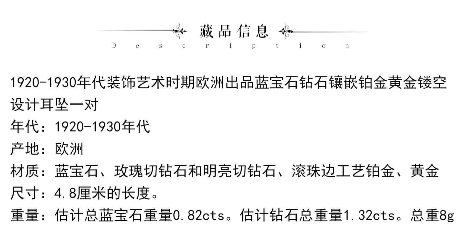 独角鹿西洋古董珠宝首饰蓝宝石钻石镶嵌铂金黄金镂空设计耳坠耳饰
