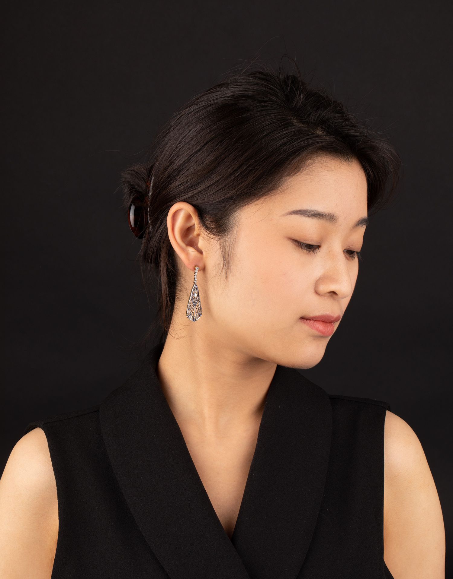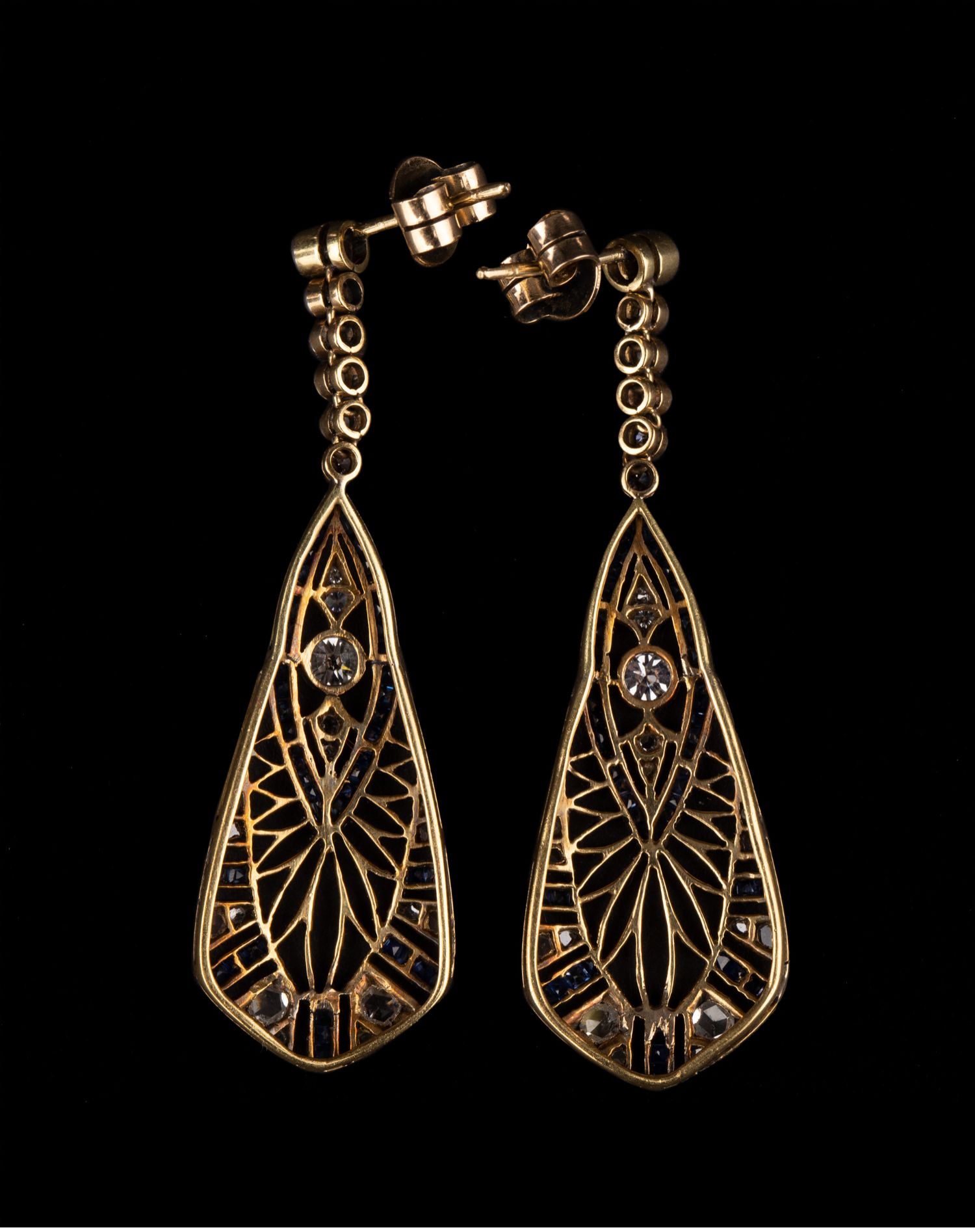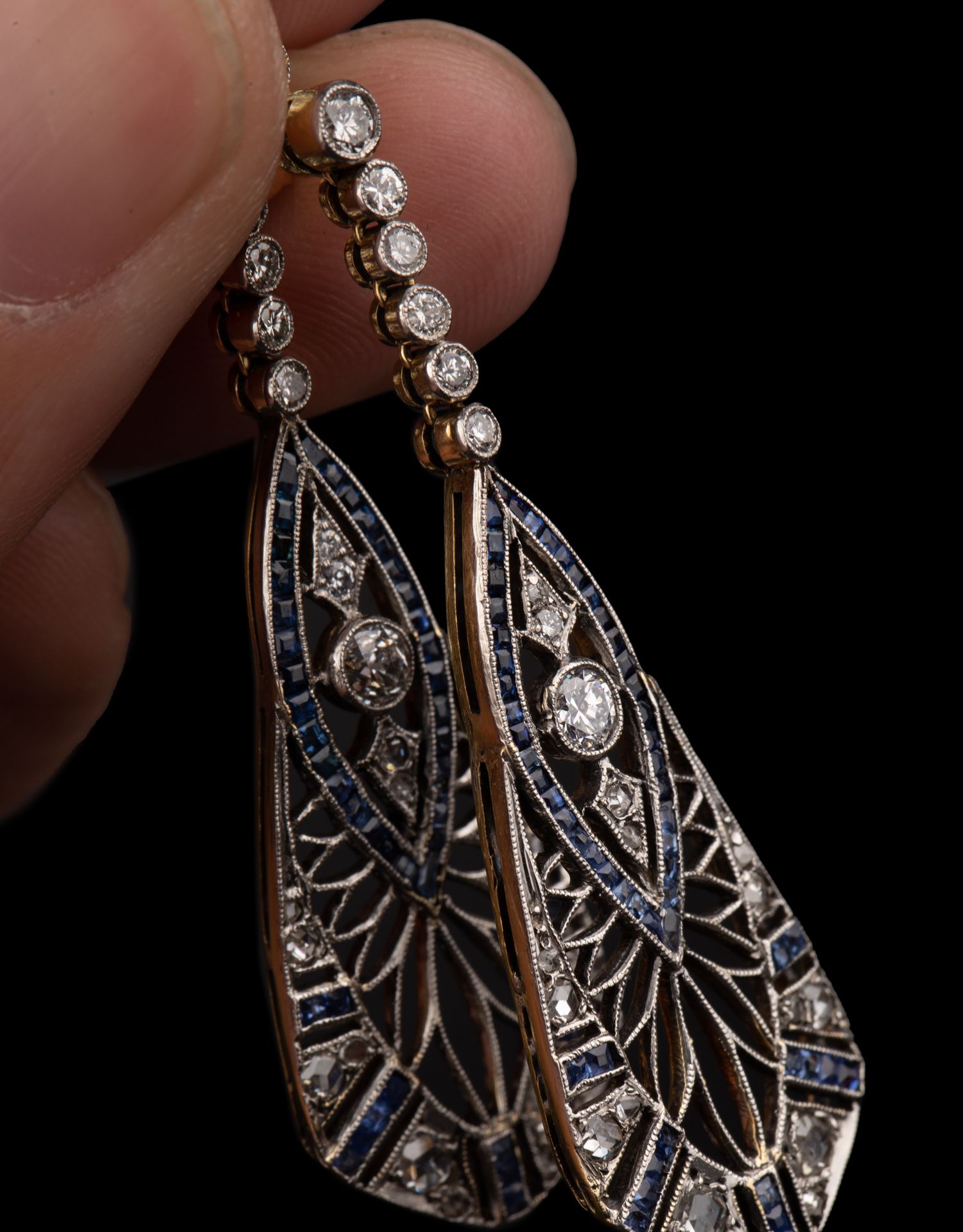 独角鹿西洋古董珠宝首饰蓝宝石钻石镶嵌铂金黄金镂空设计耳坠耳饰