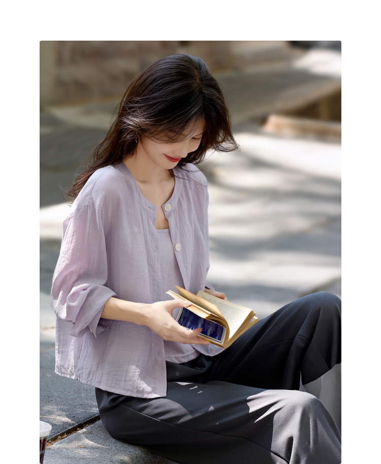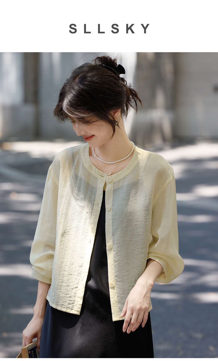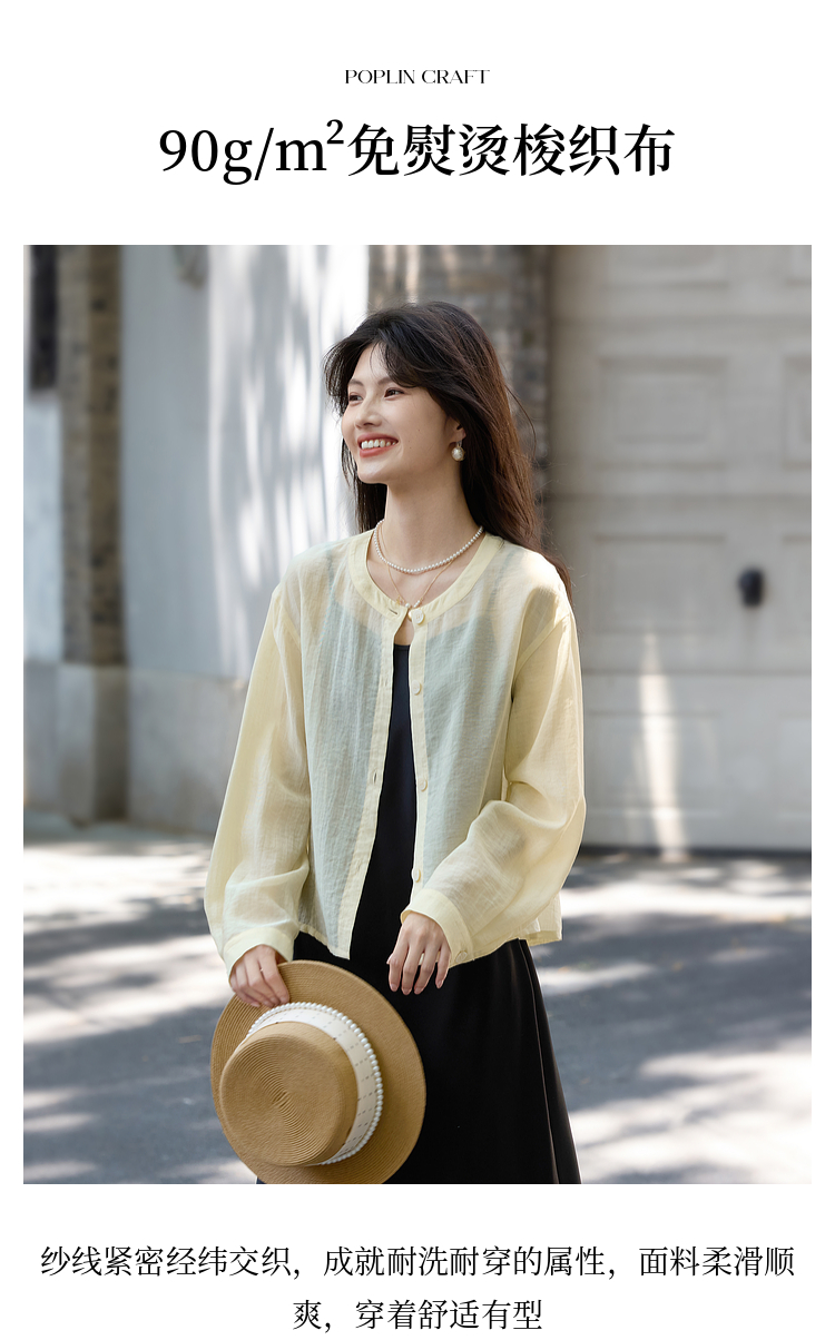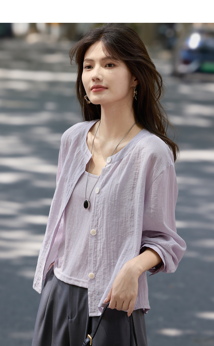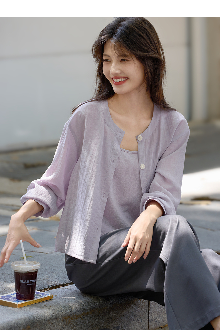 【08/06新品】熙世界淡人穿搭法式圆领衬衫女夏秋薄款长袖圆领防晒上衣2025新款