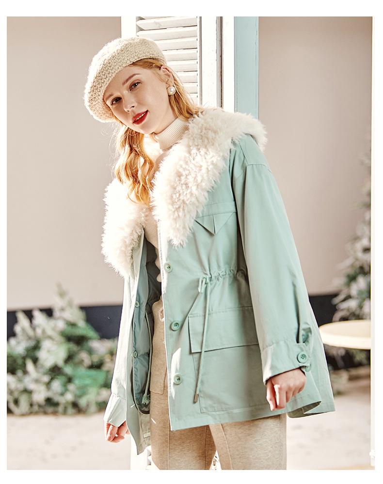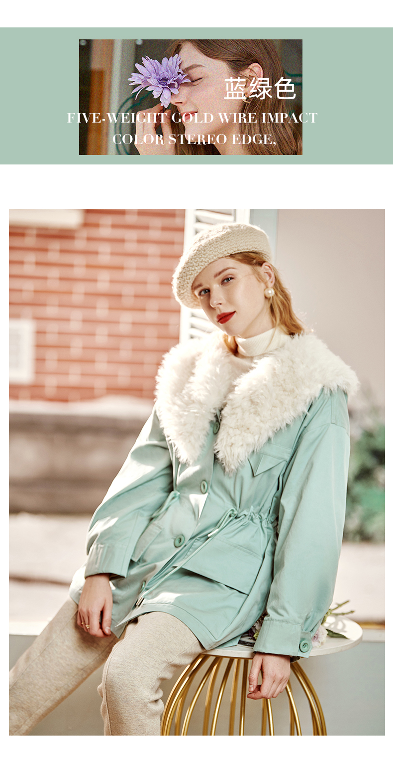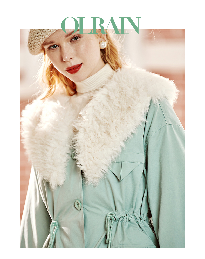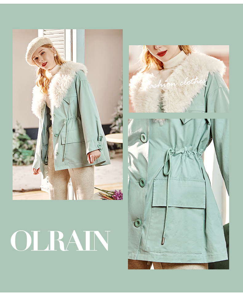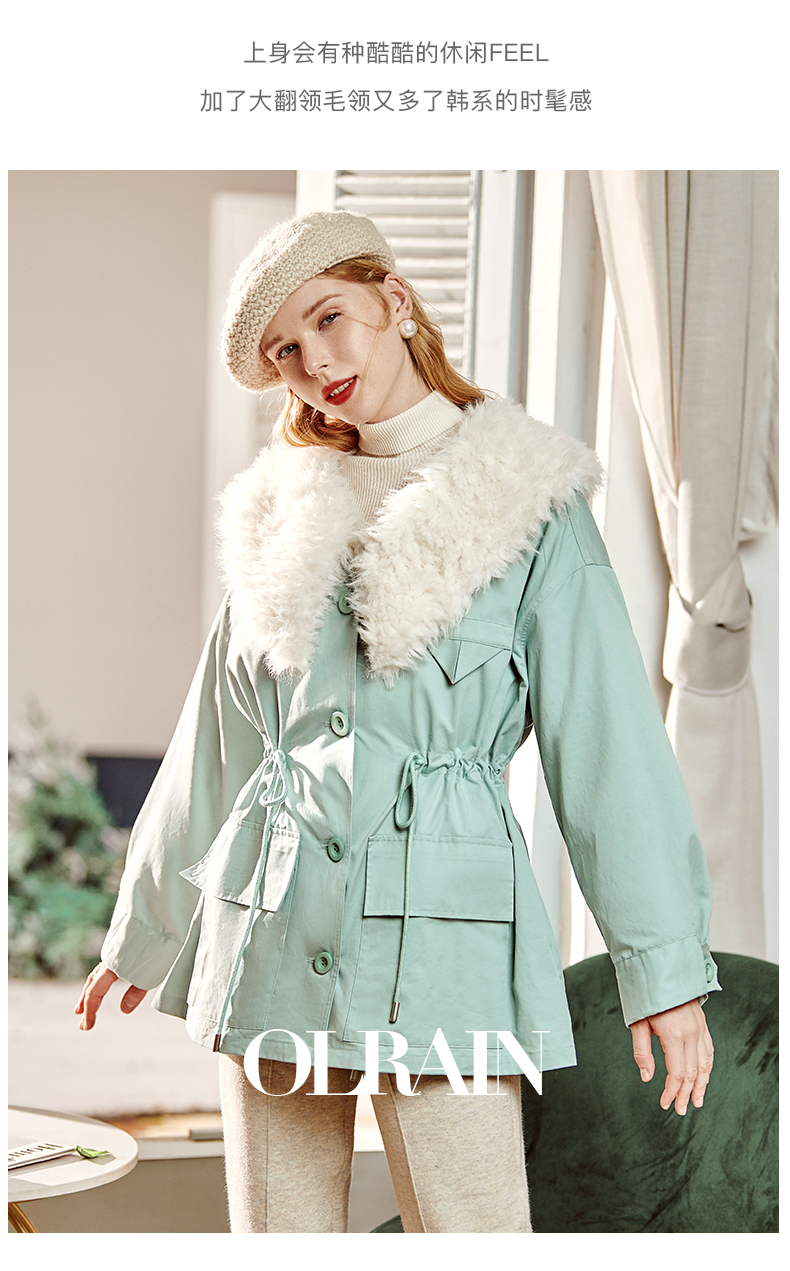 欧芮儿2021冬季新款可拆卸毛领抽绳收腰显瘦羽绒服女派克翻领外套