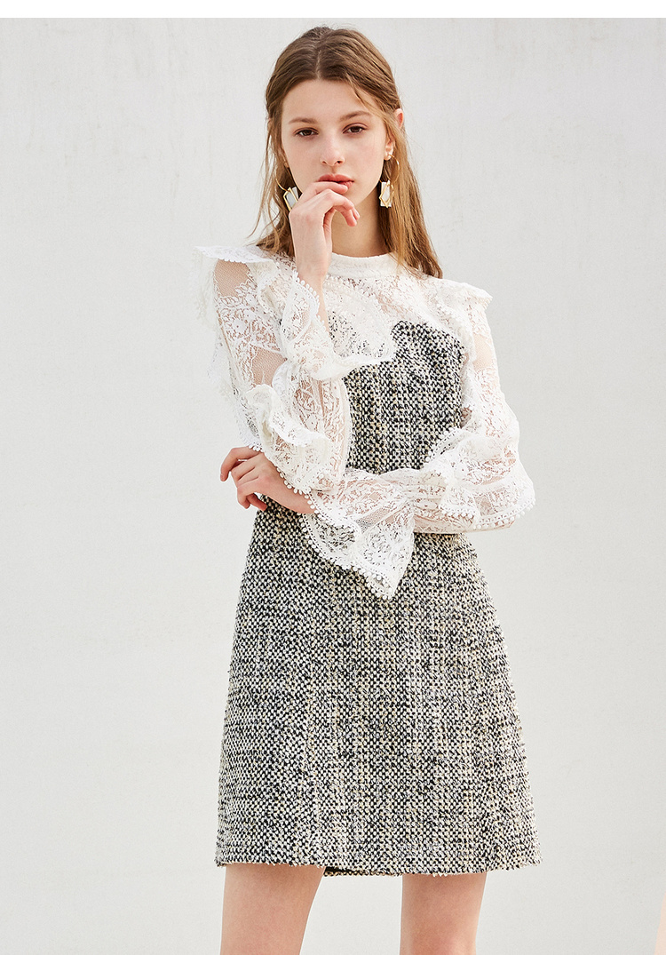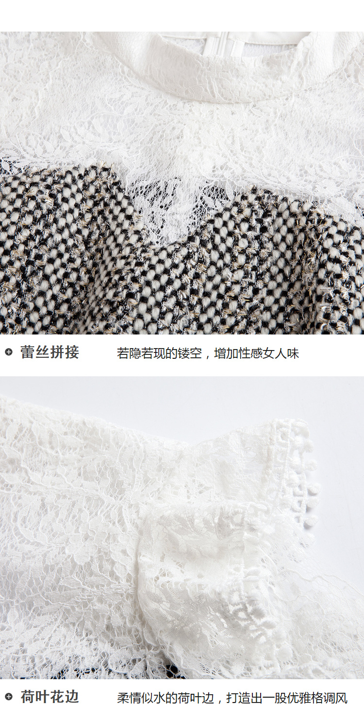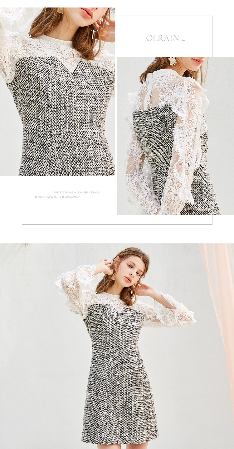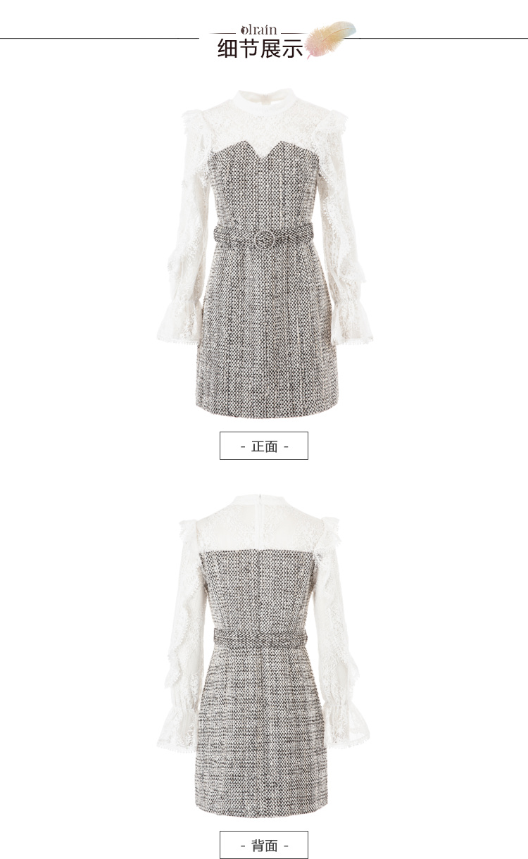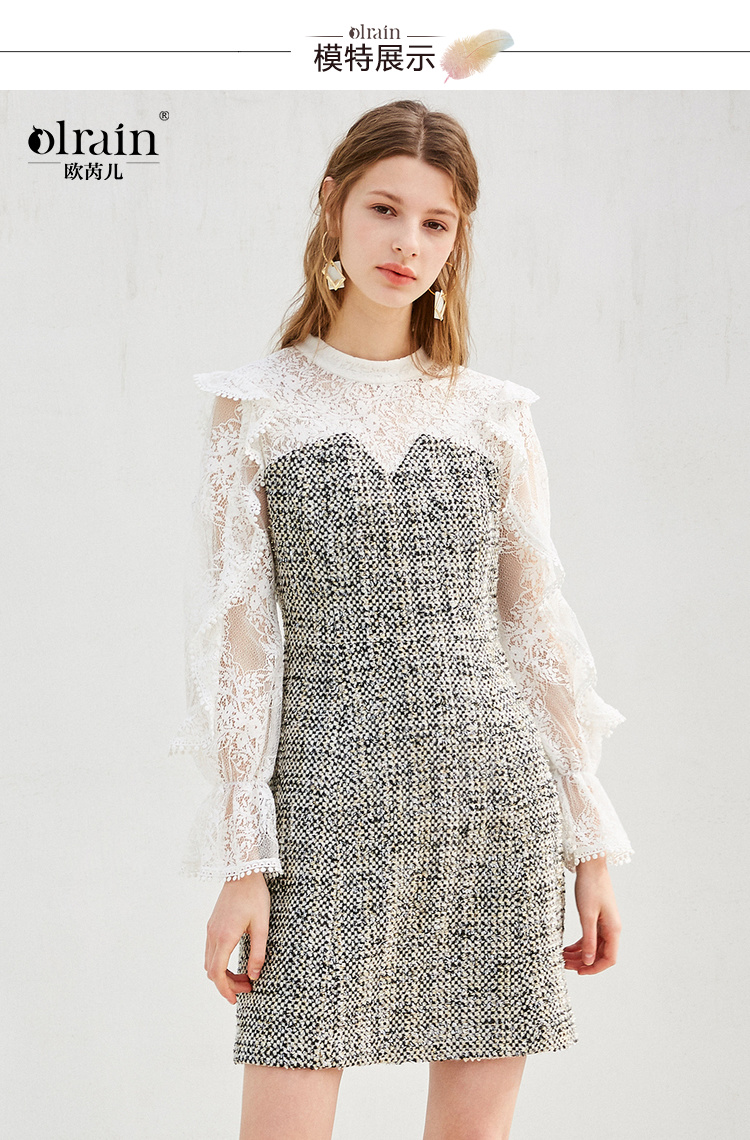 欧芮儿蕾丝拼接连衣裙女中长款春装2019新款荷叶边针织女裙子