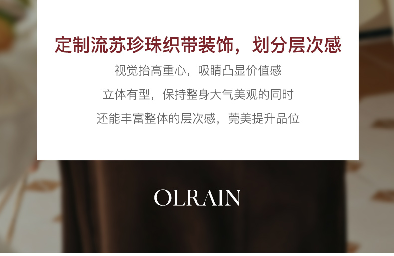 “精致”是欧芮儿olrain品牌文化的核心,欧芮儿认为,精致的女人,不但要外在动人,更要内在迷人,内外兼修,有魅力、有气质、有内涵,自信而不自傲,优雅而不矫揉,自有万种风情而不轻浮,更不故作矜持。