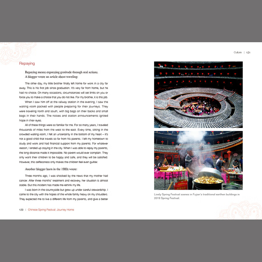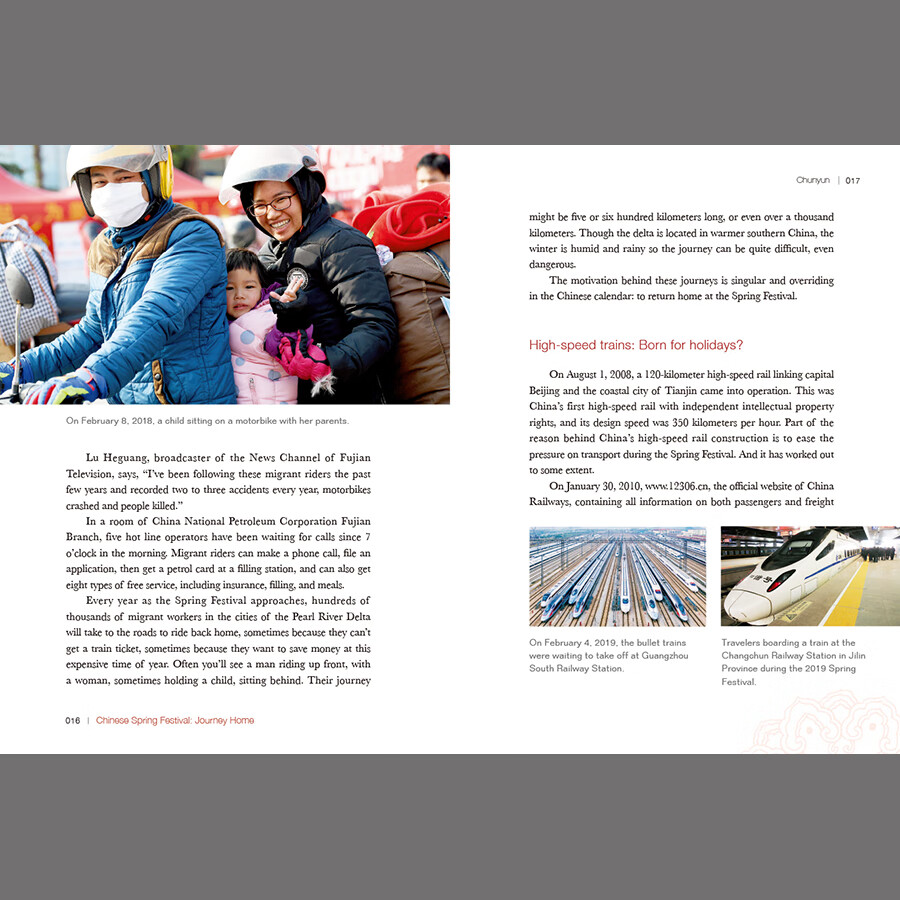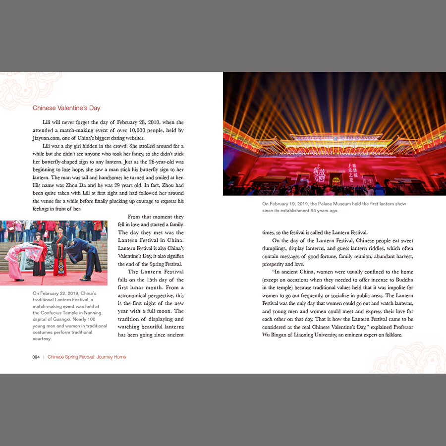 这是一本针对外国读者介绍中国春节文化的图文书。从春运说起,为什么中国人在此刻排除万难地要回家团聚,里面蕴含着什么样的文化基因;讲述春节传统民俗,以及随着时代的发展、观念的更新,传统的变与不变;展现春节在世界上越来越广泛的影响等等,以个体中国人生动感人的春节故事串联全书。本书图文并茂,可读性强,通过春节这个节点向世界展现中国春节的民俗风情和中国人对美好生活的追求。