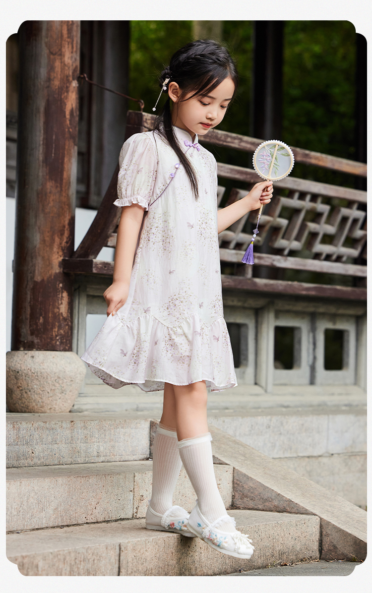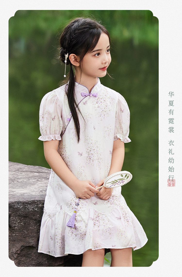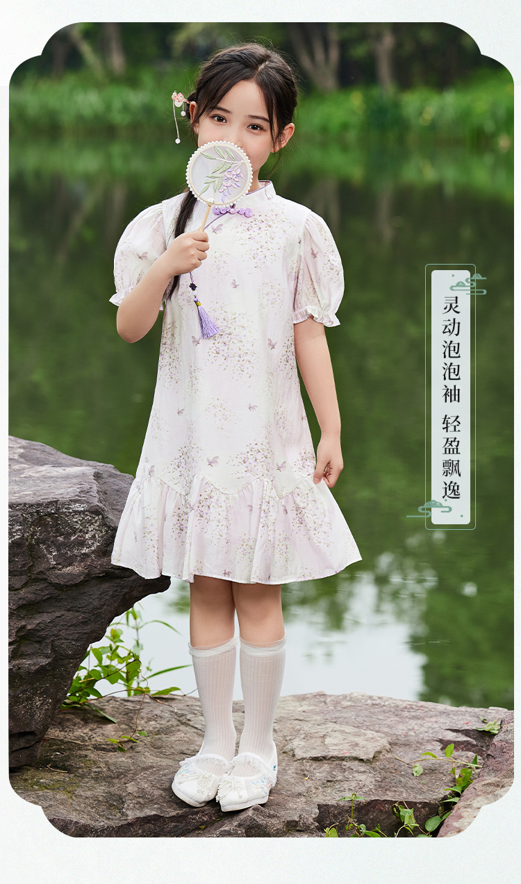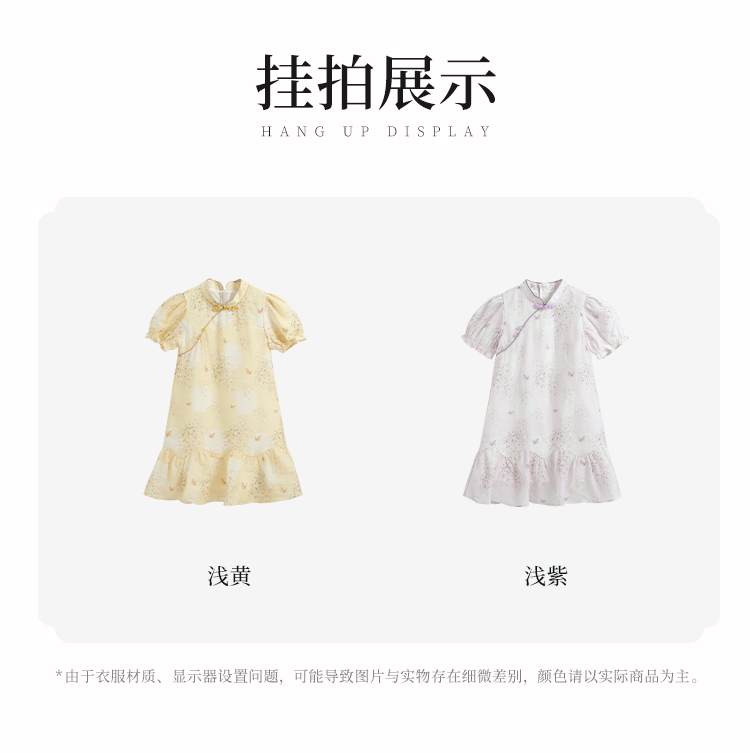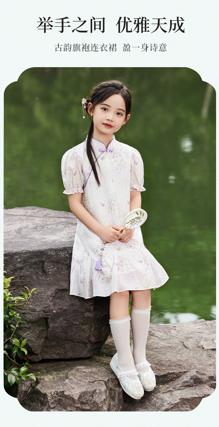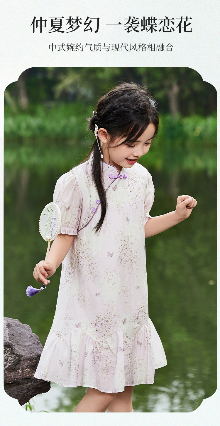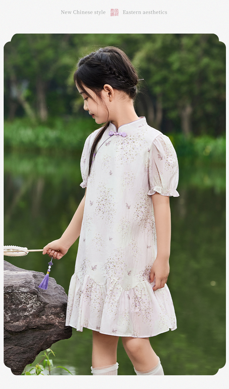 【英氏限时清仓】【甜美新中式】【150-165】女童改良旗袍裙荷叶边裙摆仙女裙