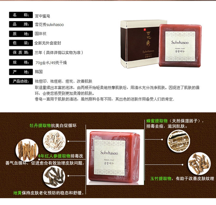 【现货】韩国 雪花秀SULWHASOO宫中新版蜜皂50g 清洁透白滋养修复保湿不紧绷