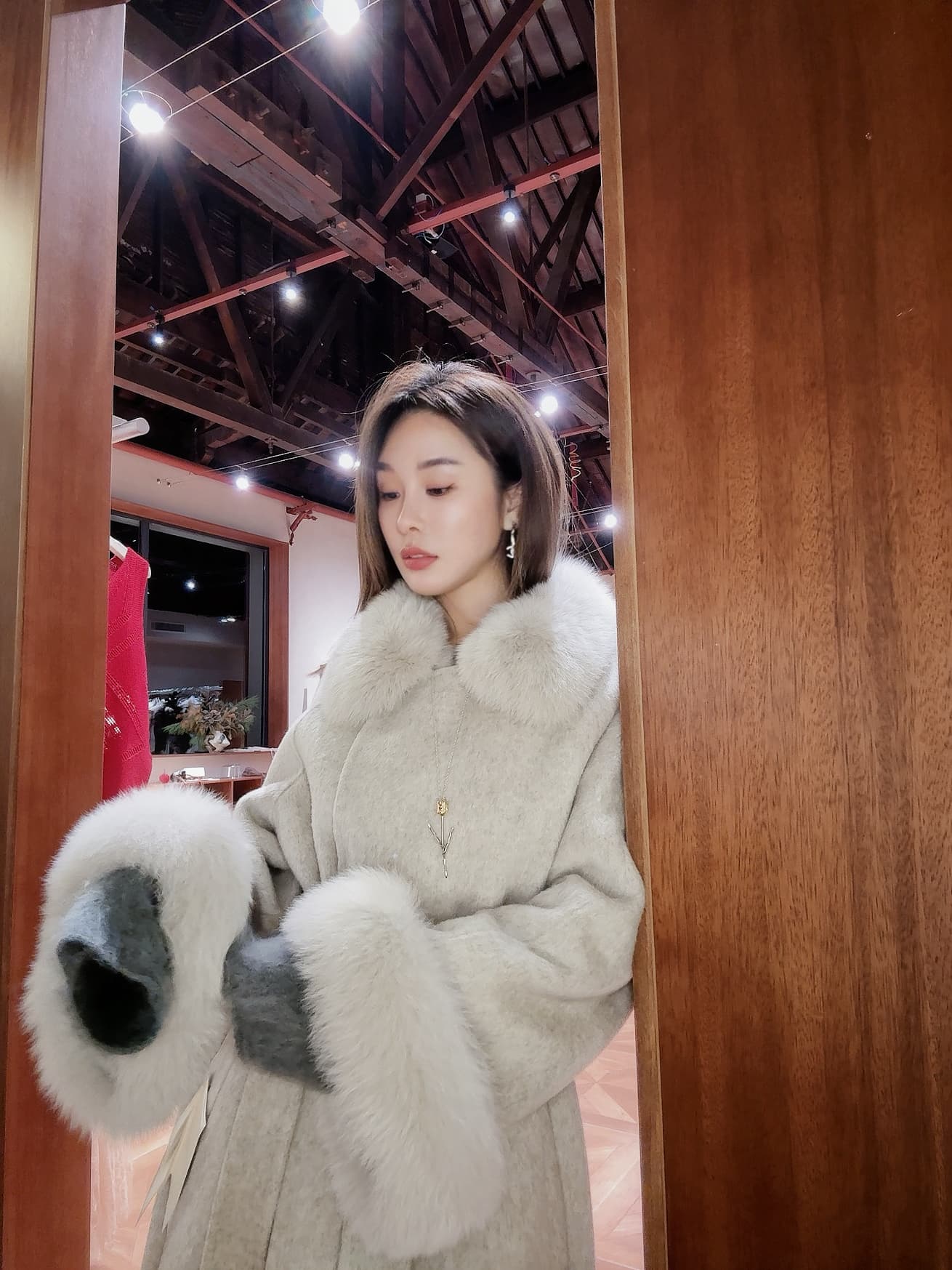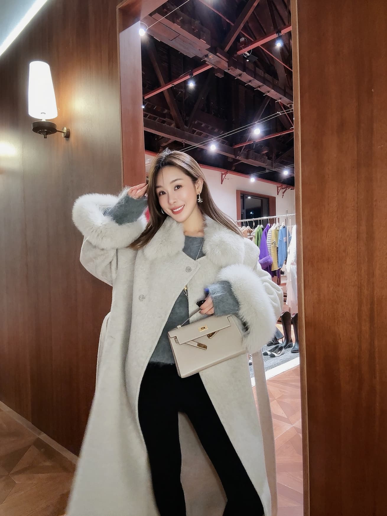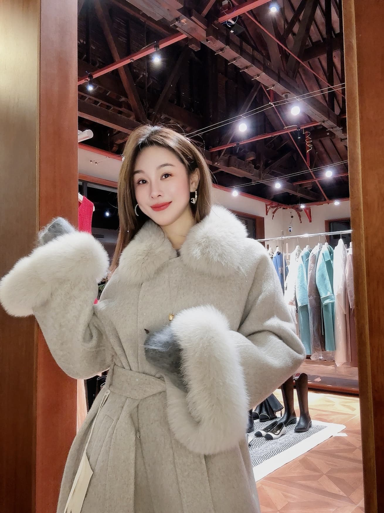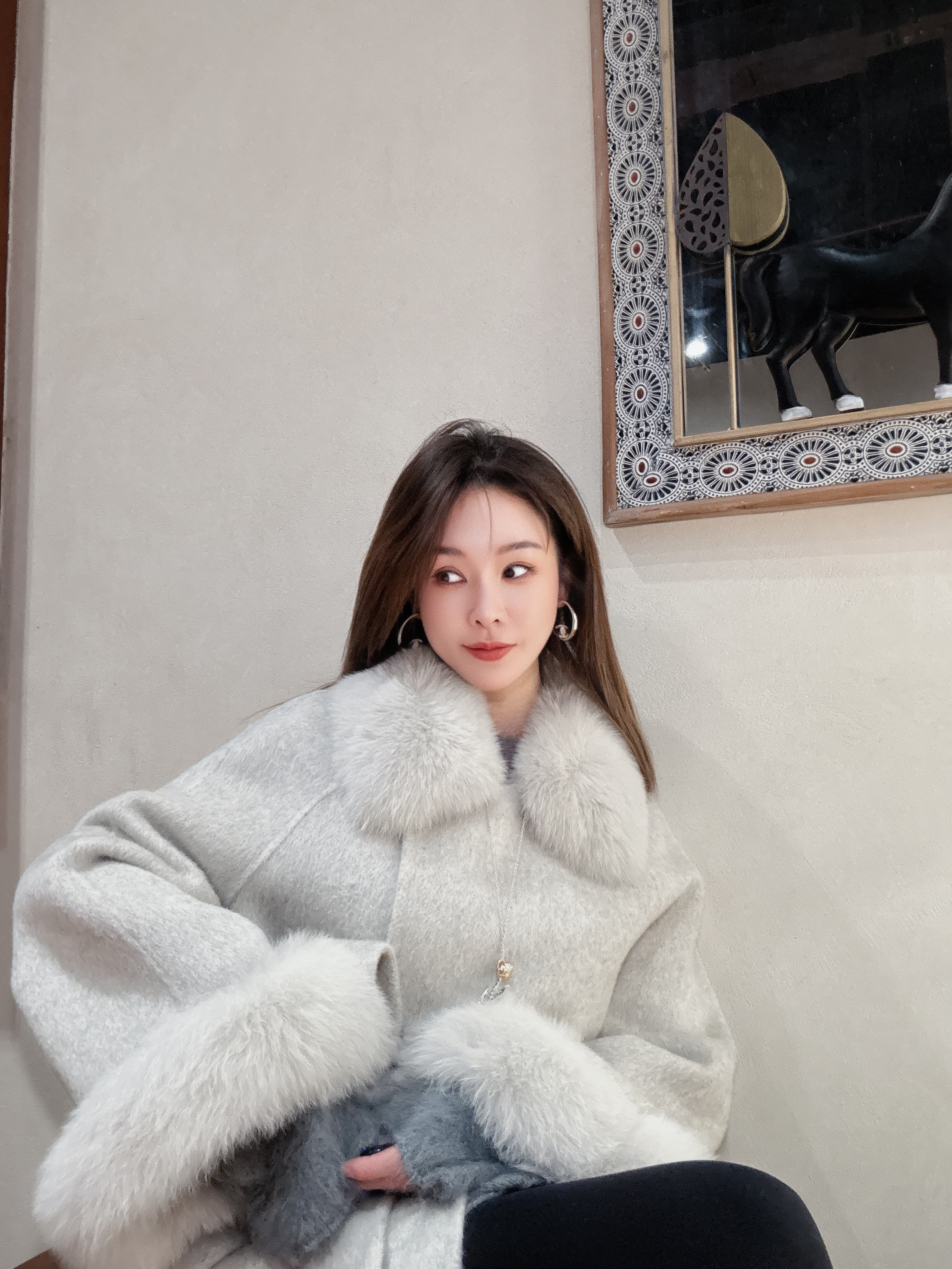 PIANAI冷小姐# 灰色狐狸毛可拆卸大毛领双面呢大衣