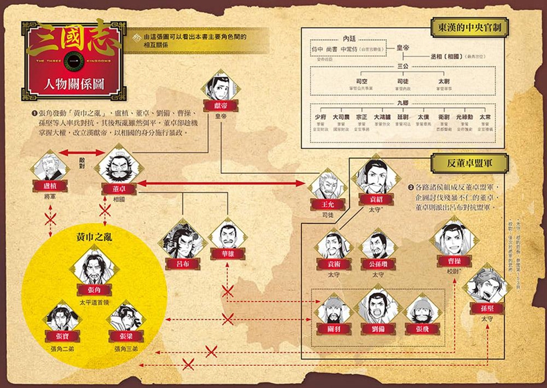 特色3:書中收錄「人物關係圖」、「地圖」、「人物事典」、「名勝遺跡」、「成語典故」等,將三國故事與歷史、地理、人物生平和背景資訊做連結,並搭配文物和遺跡等照片解說,讓人彷彿置身三國百寶庫,透澈無礙的窺見三國全貌。