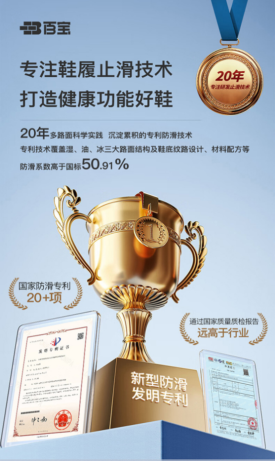 百宝止滑鞋秉持“全力保障人们的出行安全,打造更科学的止滑鞋标准”的品牌使命 以价格亲民、时尚无龄感、健康舒适和安全防滑的属性,深受消费者喜爱。