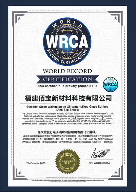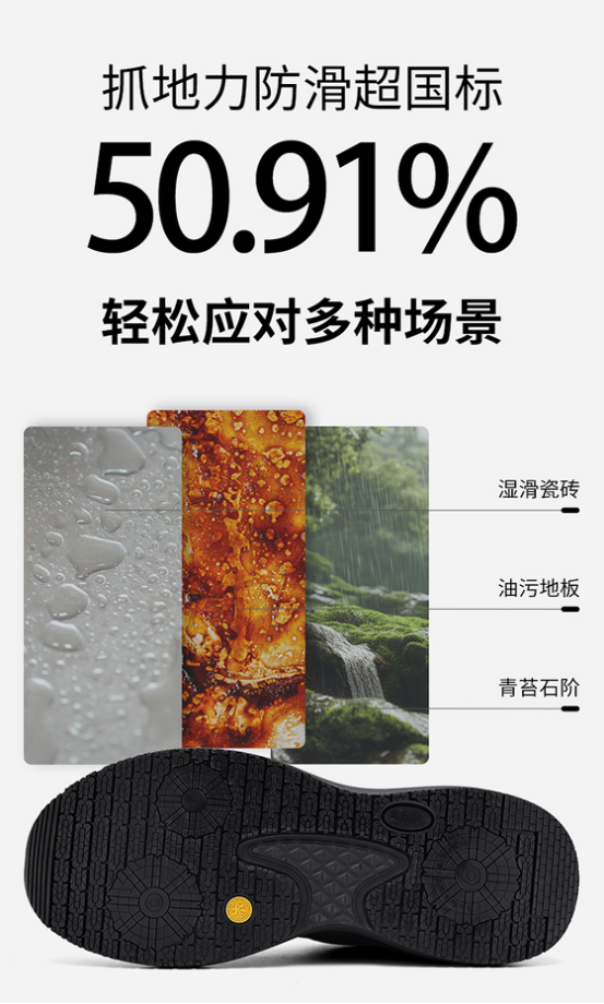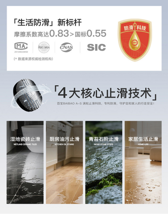 百宝直接打破 WRCA “最大坡度行走于油水混合玻璃表面” 世界纪录,在 26 度钢化玻璃斜坡 + 食用油水的极端湿滑环境下,穿着它能全程无滑移稳步上行。 这个认证可不是噱头,而是经权威机构全程监督核验的硬实力,不管是雨天湿滑的石板路、菜场油腻的地面,还是家里浴室的瓷砖,都能牢牢抓地,从源头减少摔倒风险。