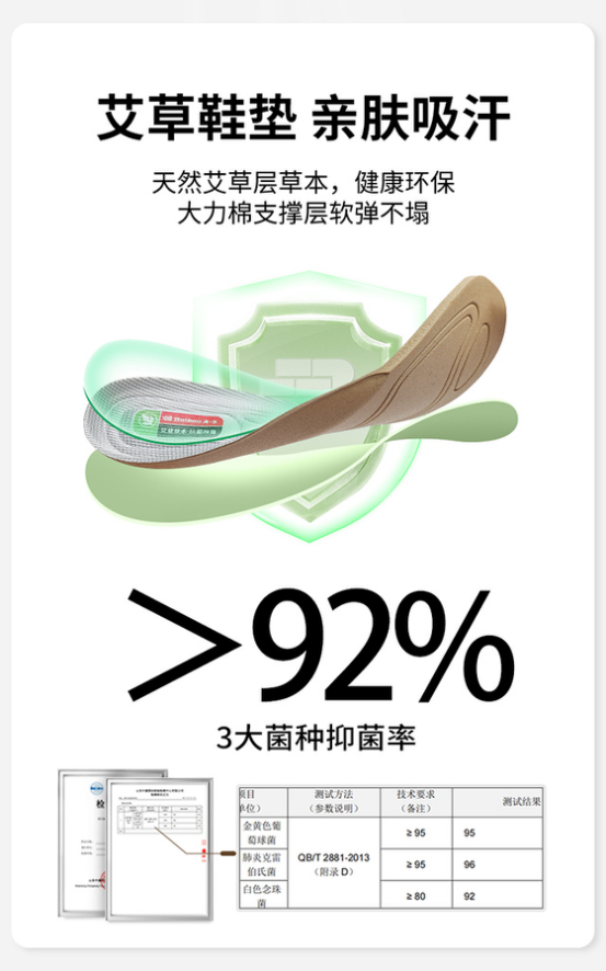 鞋垫添加天然艾草成分,不仅能带来温和暖意呵护脚底,能有效抑制细菌滋生,告别脚臭烦恼。 就算长时间走路出汗,也能保持鞋内干爽无异味,久穿也清爽舒适,给双脚贴心守护。