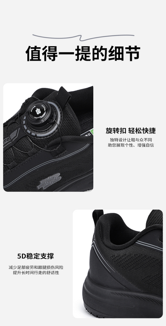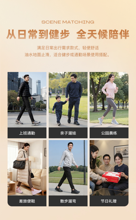弹性鞋口 + 一脚蹬设计,不用弯腰系鞋带,脚尖一蹬、脚后跟轻轻一踩就穿好,脱鞋也只需一踩就脱,对腰腿不便、弯腰费劲的长辈太友好。 出门赶时间、回家想放松,穿脱效率直接翻倍,日常使用省心又省力。