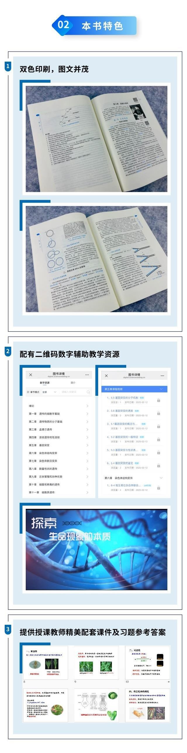 本书遵从遗传学的发展和固有的内容体系,遗传学 新研究成果和发展趋势以及作者多年的遗传学教学实践和经验,构建了一套便于学生理解和掌握的内容体系,全面、系统地介绍了遗传学的基本概念、基本原理、基本方法等;内容取材注重经典遗传学与现代遗传学的合理结合、遗传学理论与实际应用的科学结合,较全面反映了遗传学的教学要求。概念准确,文字精练,图文并茂,通俗易懂。全书共分十六章,包括遗传的细胞学基础、遗传物质的分子基础、孟德尔遗传、连锁遗传和性连锁、基因突变、染色体结构变异、染色体数目变异、数量性状的遗传、近亲繁殖和 忧势、细菌和病毒的遗传、细胞质遗传、遗传工程、基因组学、基因表达的调控、遗传与发育、群体遗传与进化。