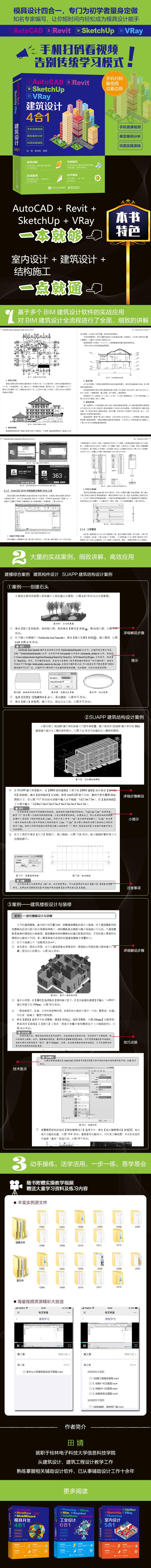本书是一本专为想在短时间内学会并掌握基于BIM建筑设计专业基础知识和行业技能应用而编写的教材。本书分别运用AutoCAD、SketchUp、Revit及VRay等建筑行业设计软件,全面介绍建筑设计基础知识、建筑工程图纸绘制、建筑模型绘制、建筑外观造型设计、建筑与结构设计,以及建筑场景渲染等知识,让读者轻松掌握基于BIM建筑设计流程所含的软件技能。本书基于多个BIM建筑设计软件的实战应用,对BIM建筑设计全流程进行了全面、细致的讲解,并配以大量的实战案例,方便读者加深理解。本书从教学与自学的易用性、实用性出发,以“用软件知识讲解上机练习技能实训”的教学方式,全面教授基于BIM建筑设计软件的基本技能和行业实践应用。本书可作为本科、大中专和相关培训学校的建筑、室内设计专业及培训教材,还可作为即将和已经从事室内设计、建筑设计、结构施工等专业技术人员,以及想快速提高BIM建筑软件应用的爱好者的参考用......