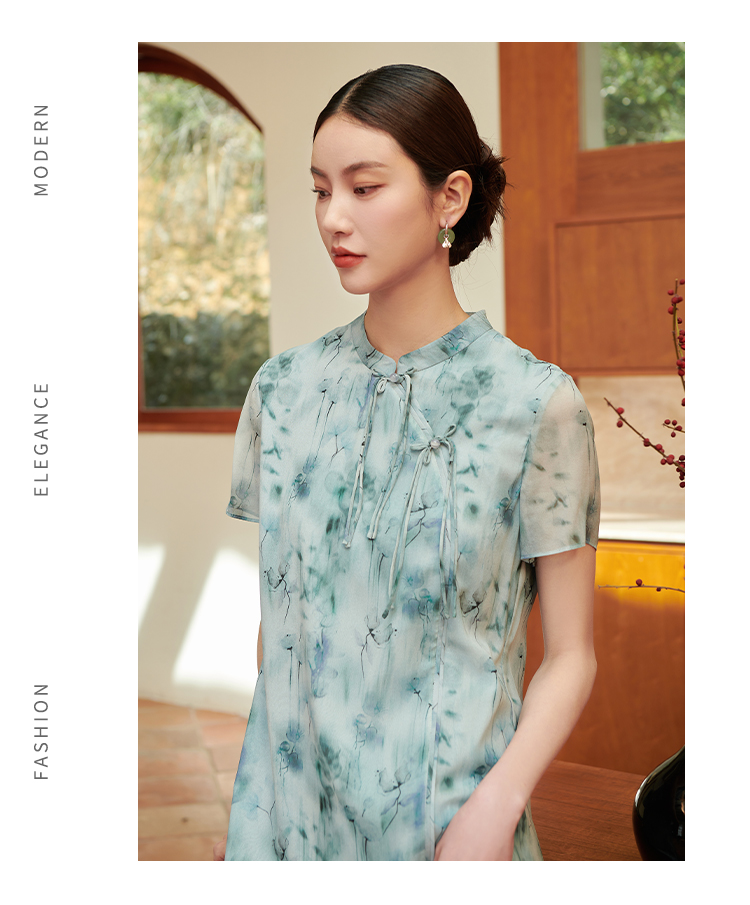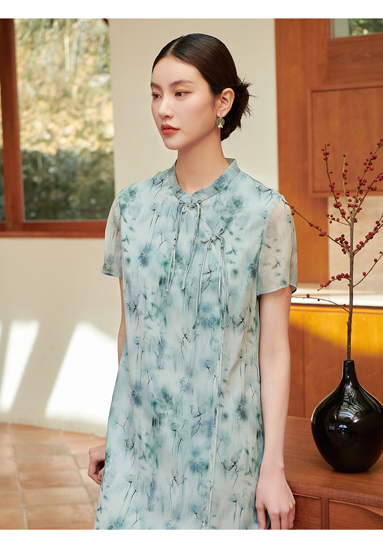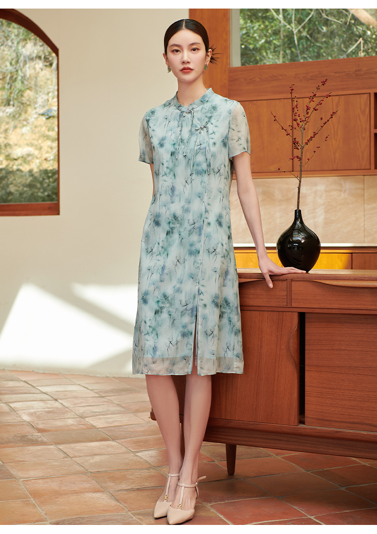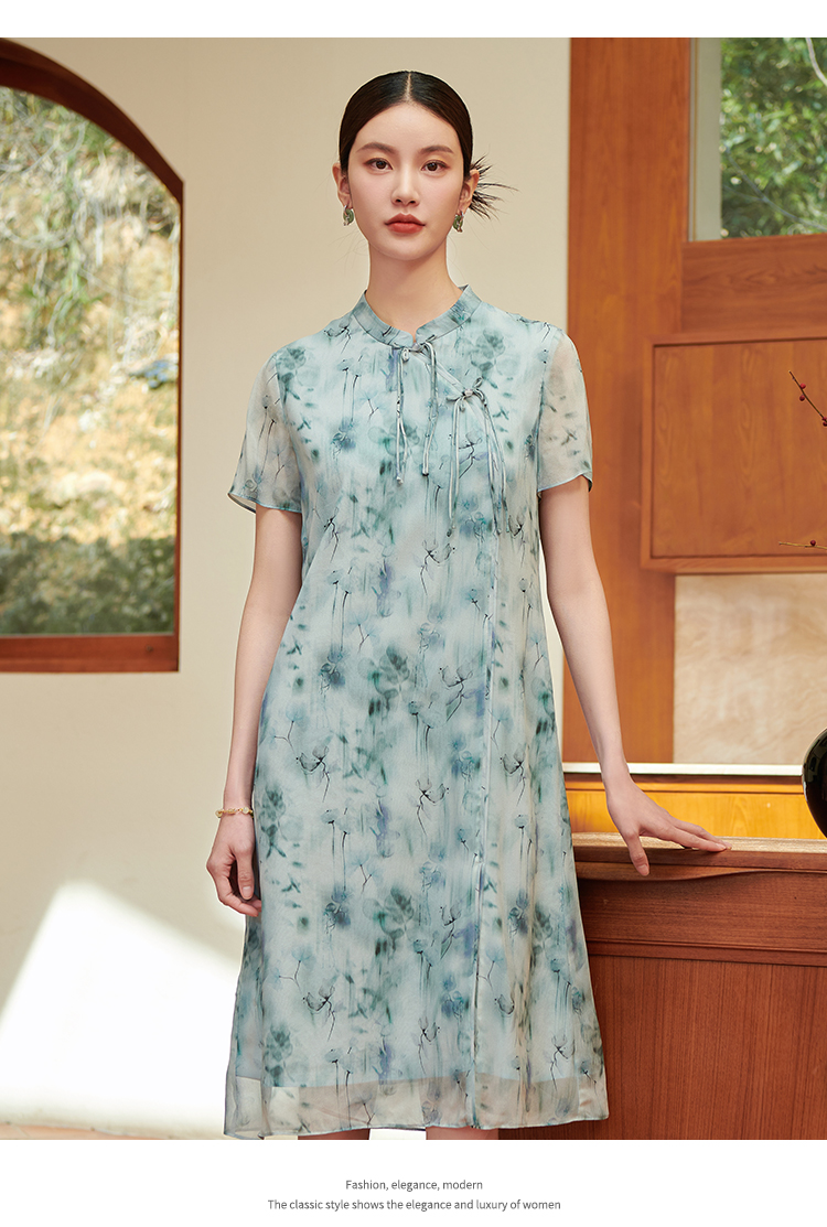佐尔美气质新中式碎花100%桑蚕丝连衣裙女M42LS28