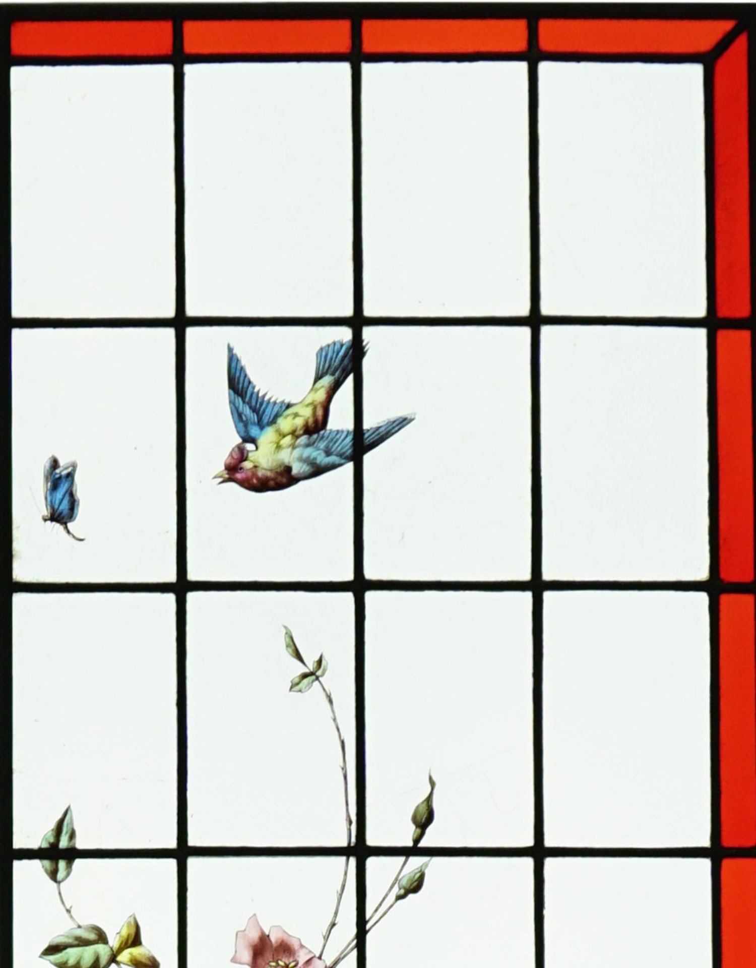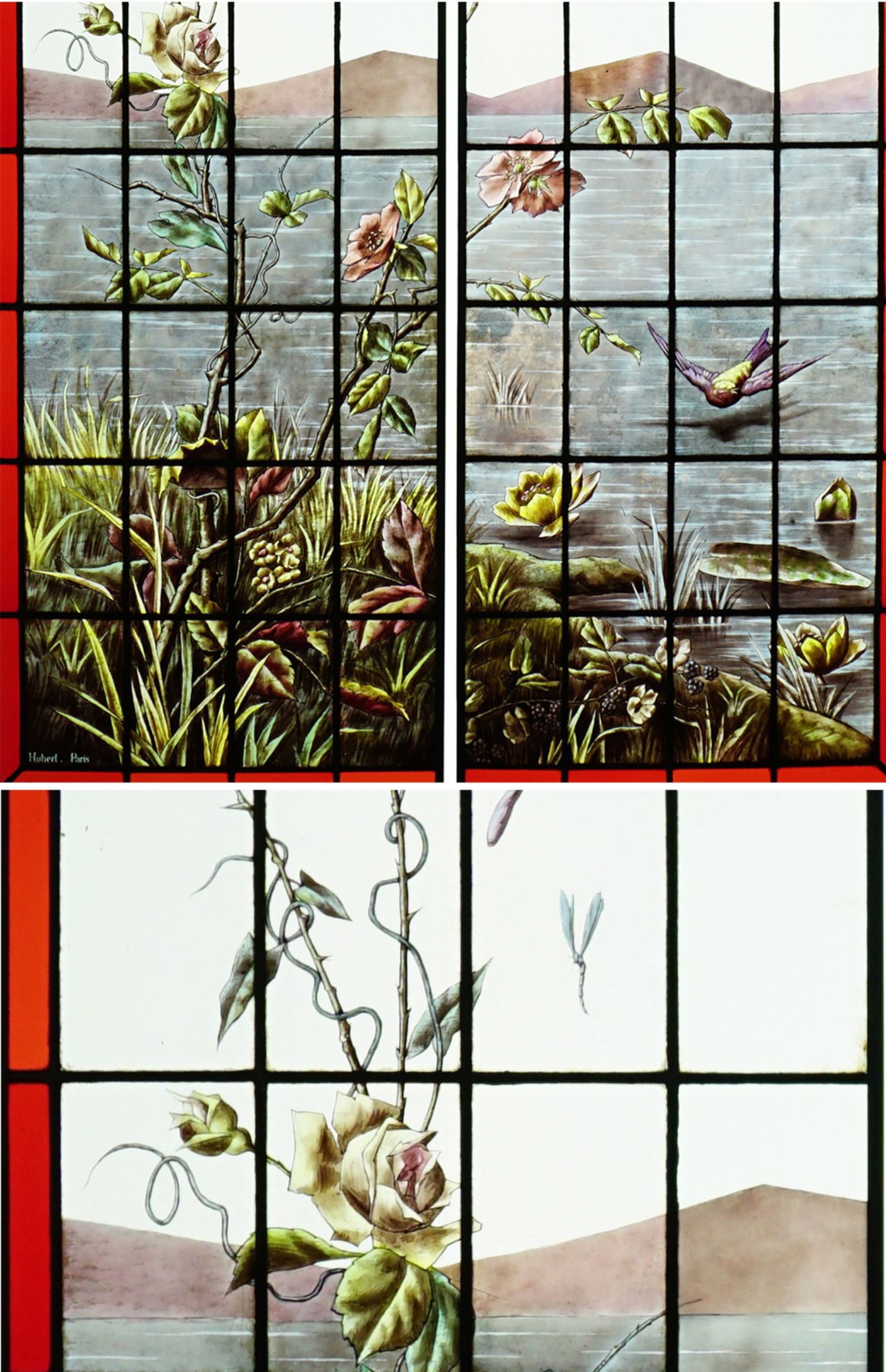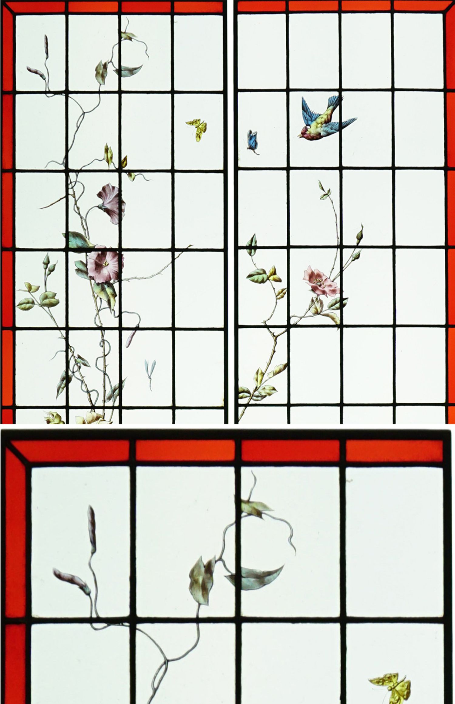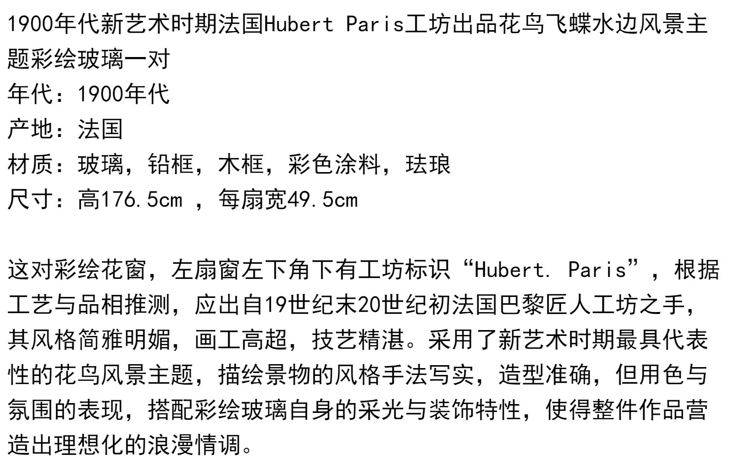 独角鹿西洋古董法国工坊花鸟飞蝶水边风景彩绘玻璃花窗一对